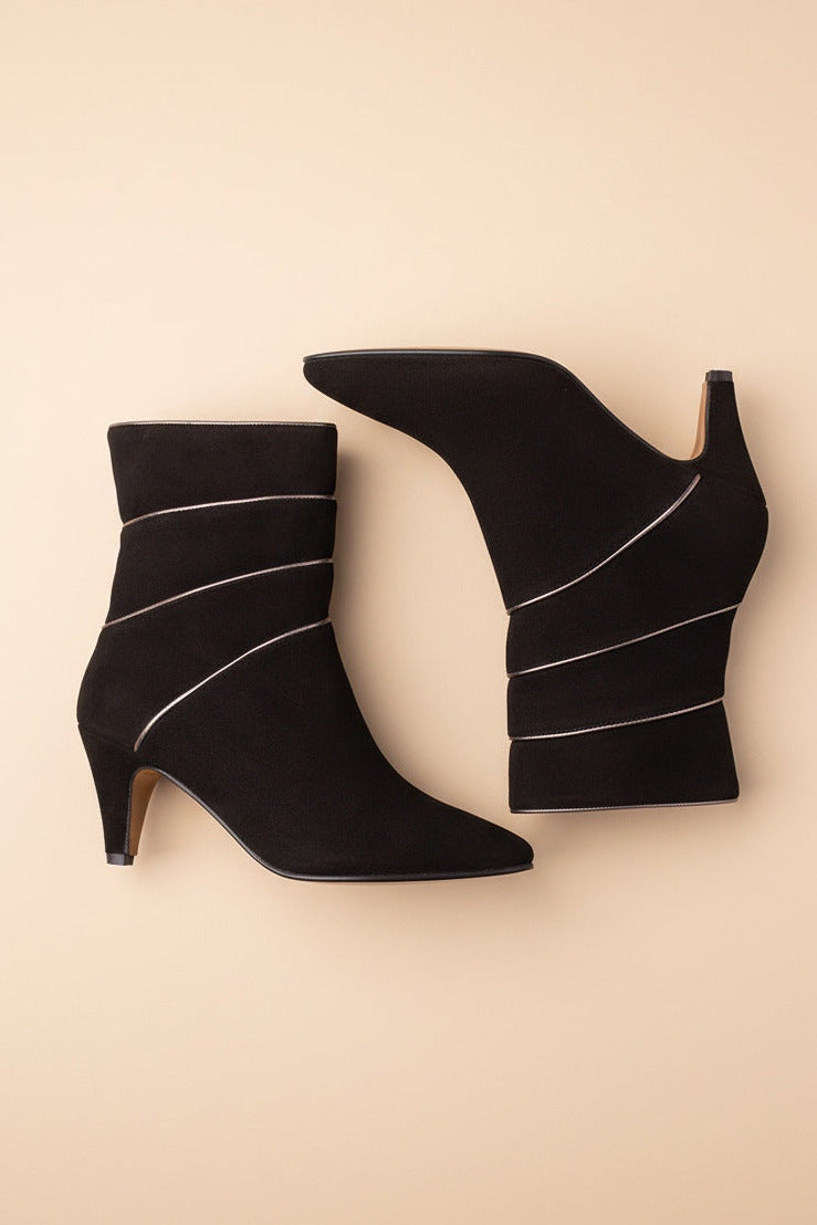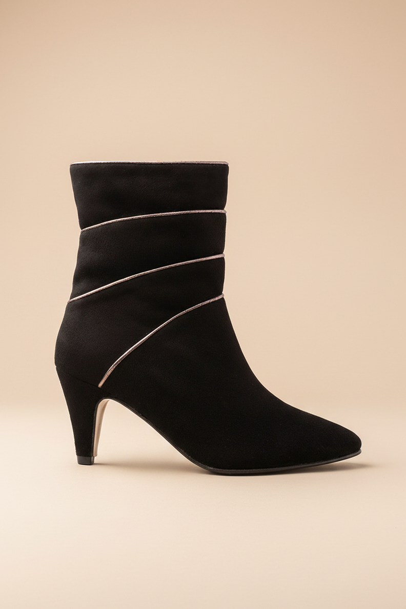 An 80’s-style black pixie boot with metallic piping and a slim wrapped heel. Team up with skinny black jeans and a silk blouse for a sleek modern look.