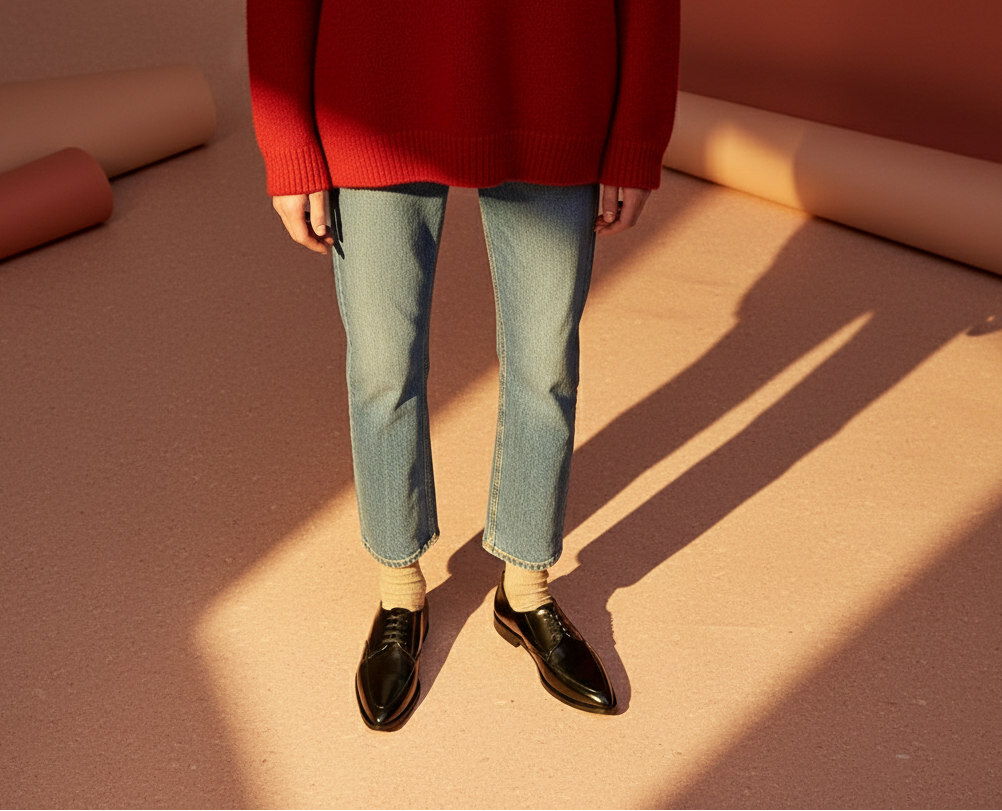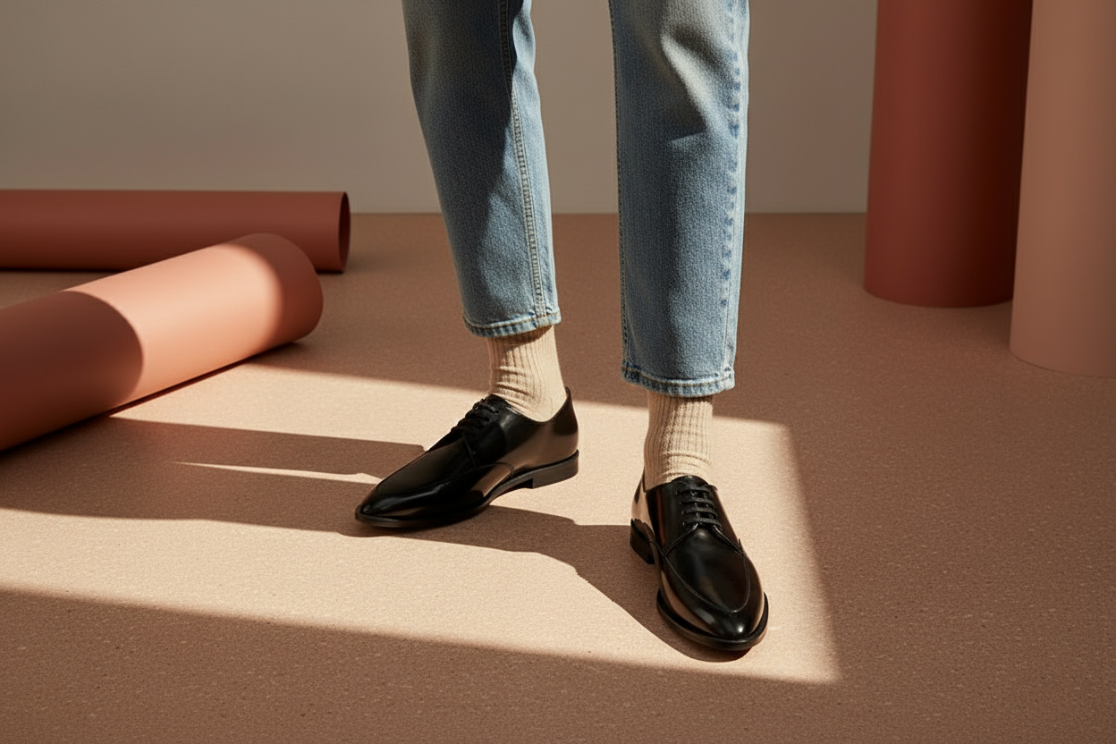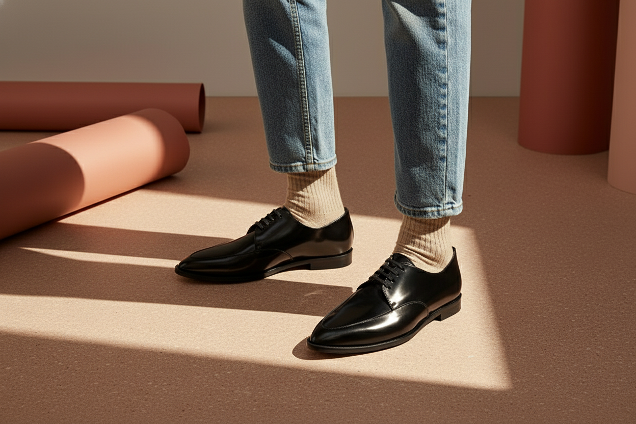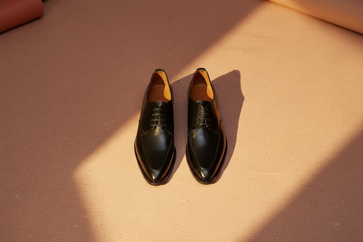 A classic derby in a polished black cordovan italian leather.This rock and roll styled shoe has an exquisite pointed toe providing a feminine touch to the design.A must piece for any contemporary footwear collection.