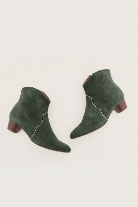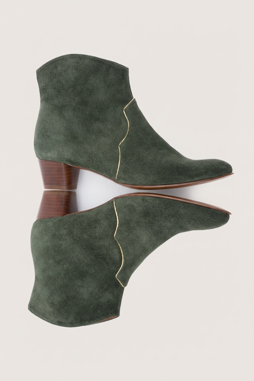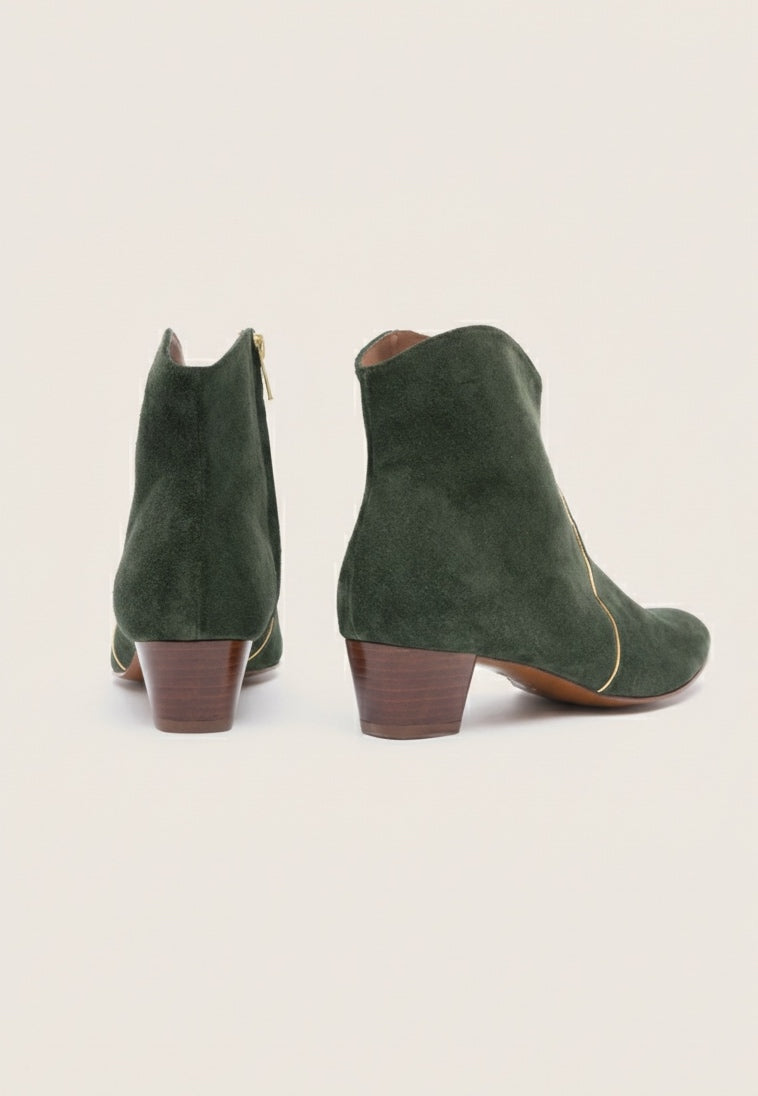 Clover is a cowboy inspired bootie handcrafted in a soft Italian green velour with a subtle gold pipping detail on vamp and shaft, interior side zip and round covered heel. Wear yours with short skirts for a flirty feel.