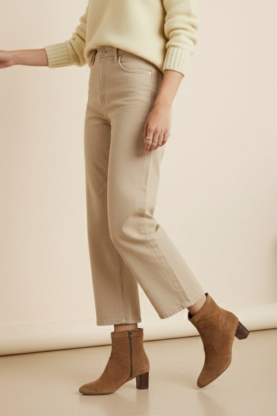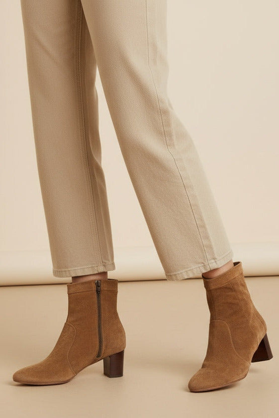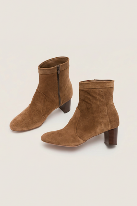 Our Dagmar bootie is crafted on a classy sand velour, featuring a rounded toe and a cuban stacked heel.Team up with your favorite denim and granny cardigan.