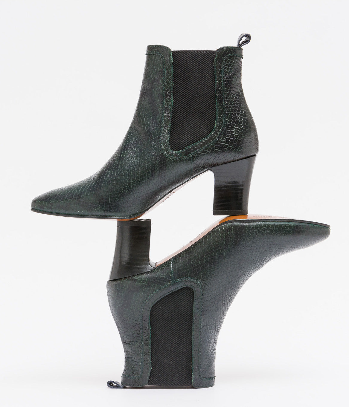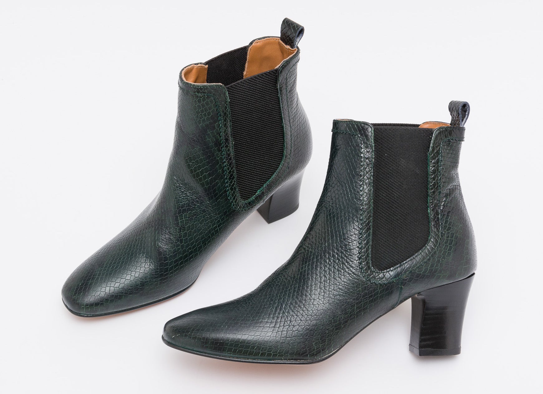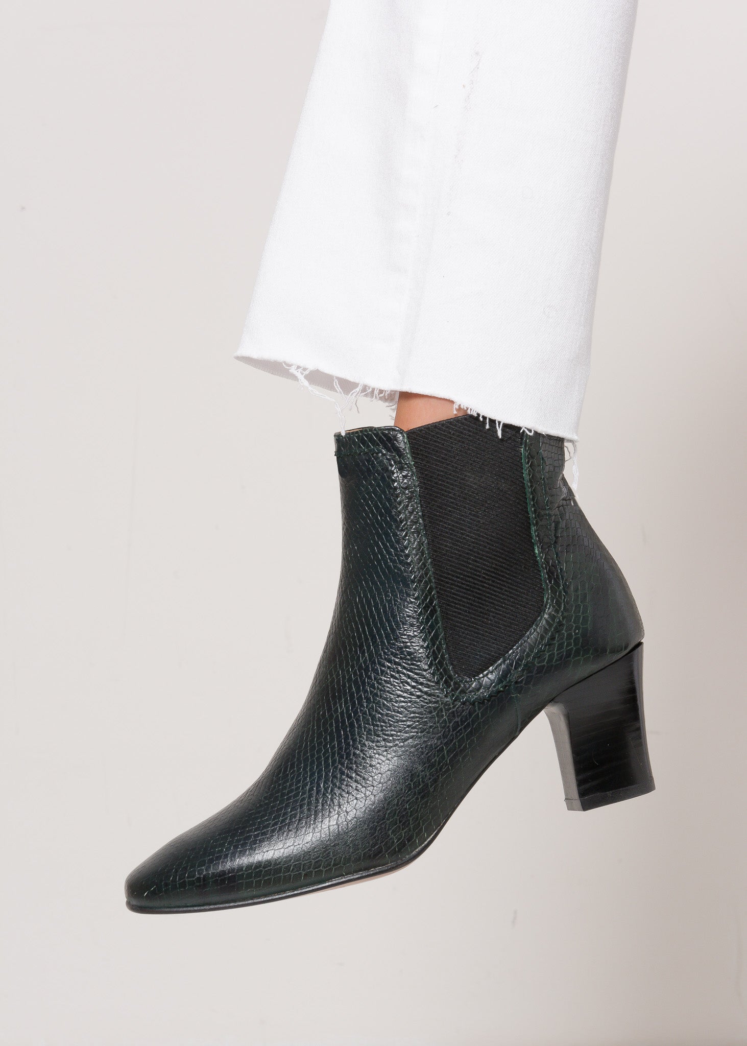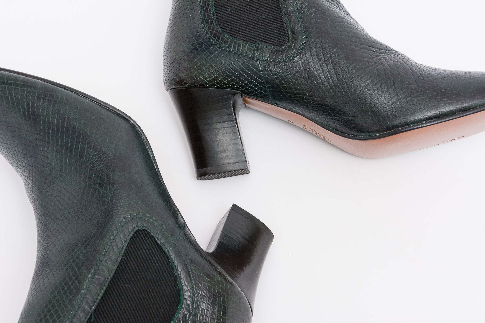 Edris was designed to become the must-have Chelsea boot in everyone's wardrobe. With its versatile 6 cm Cuban stacked heel this combination in black an green snake embossed leather can be combined with anything from a knee-length jumper dress or a simple black jean for the perfect casual Autumn outfit.