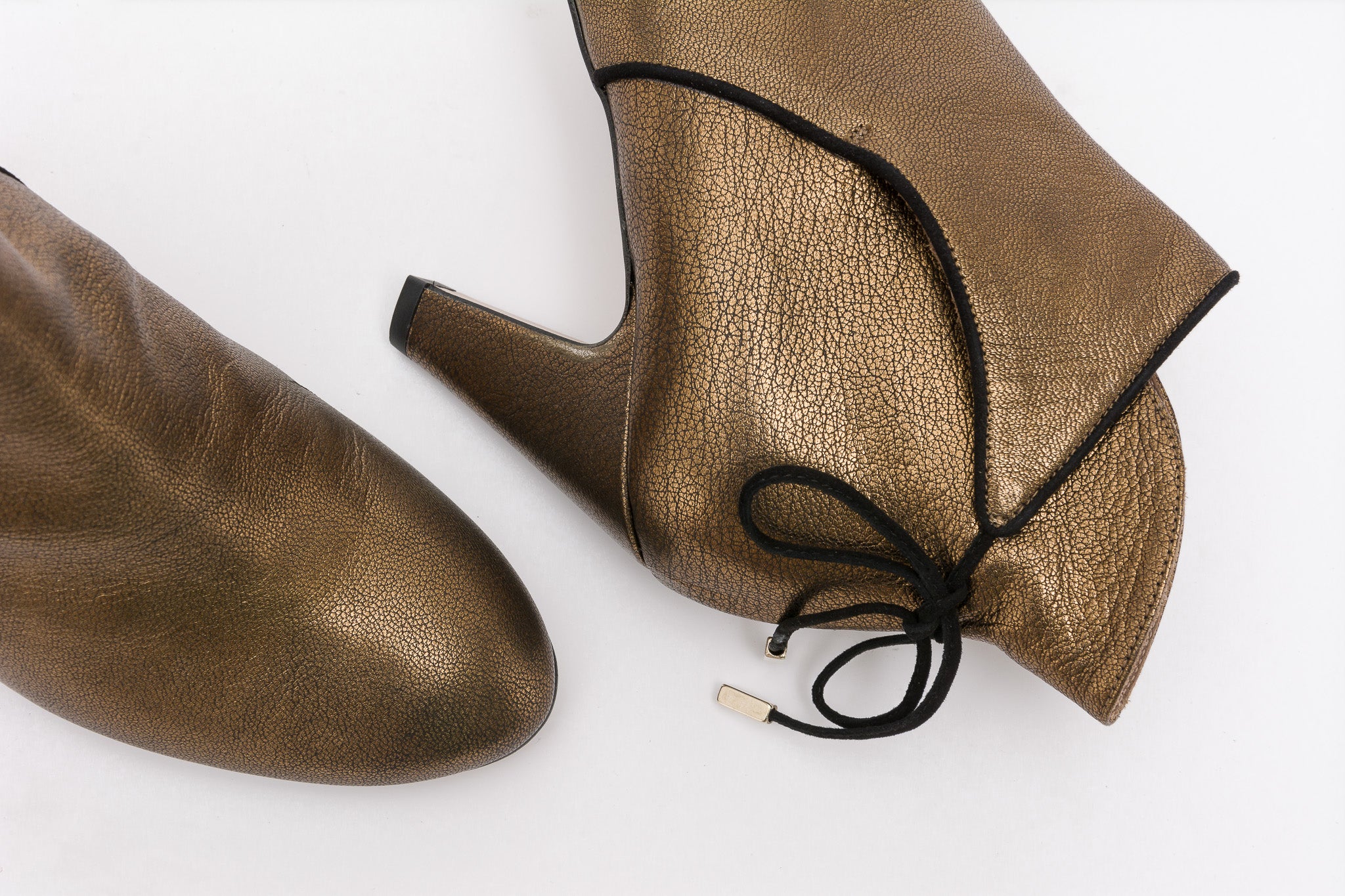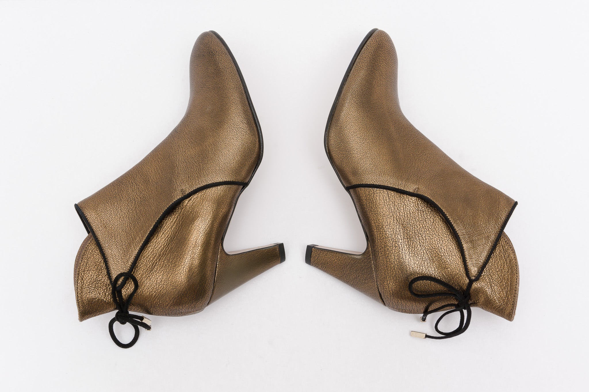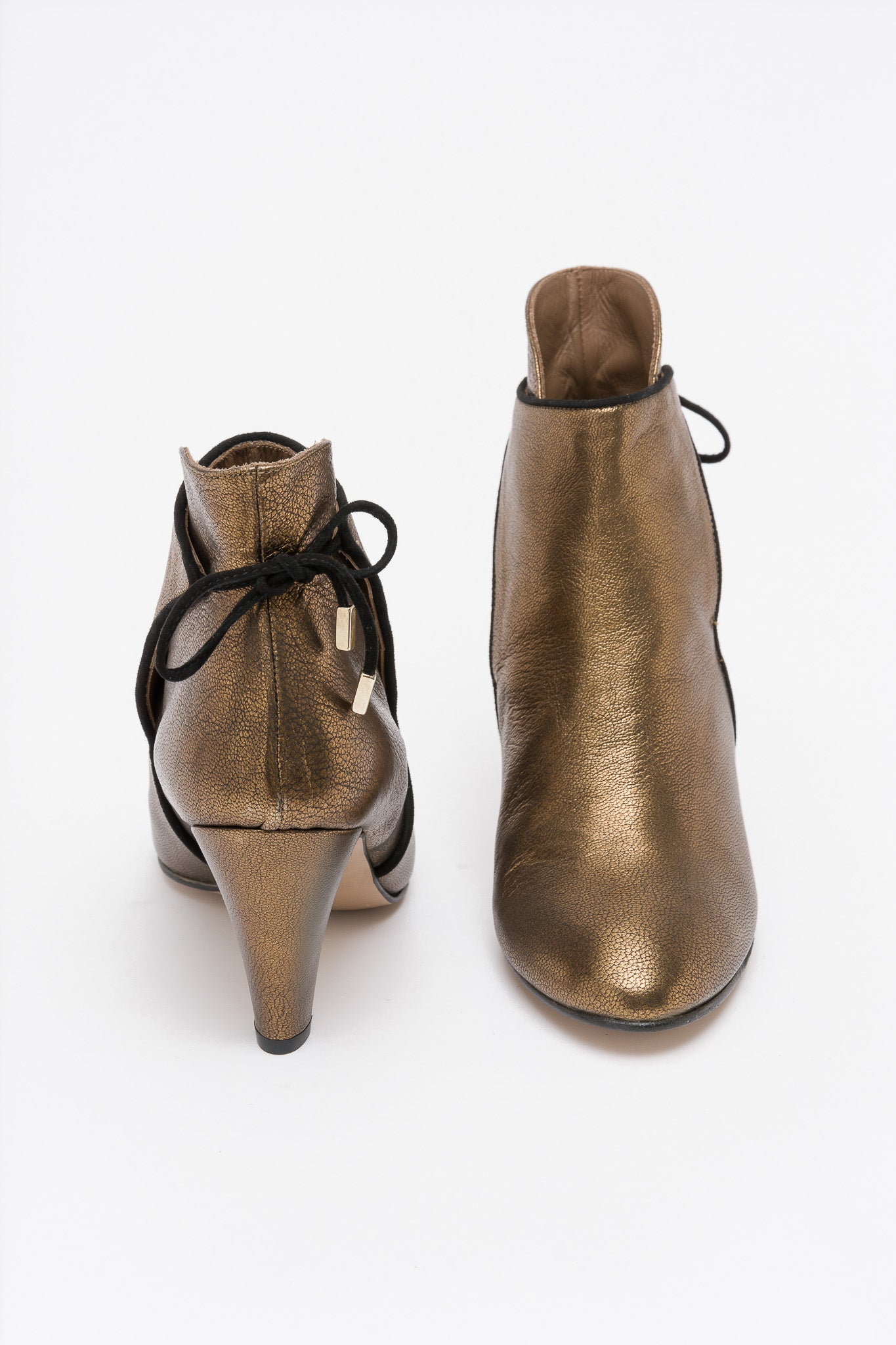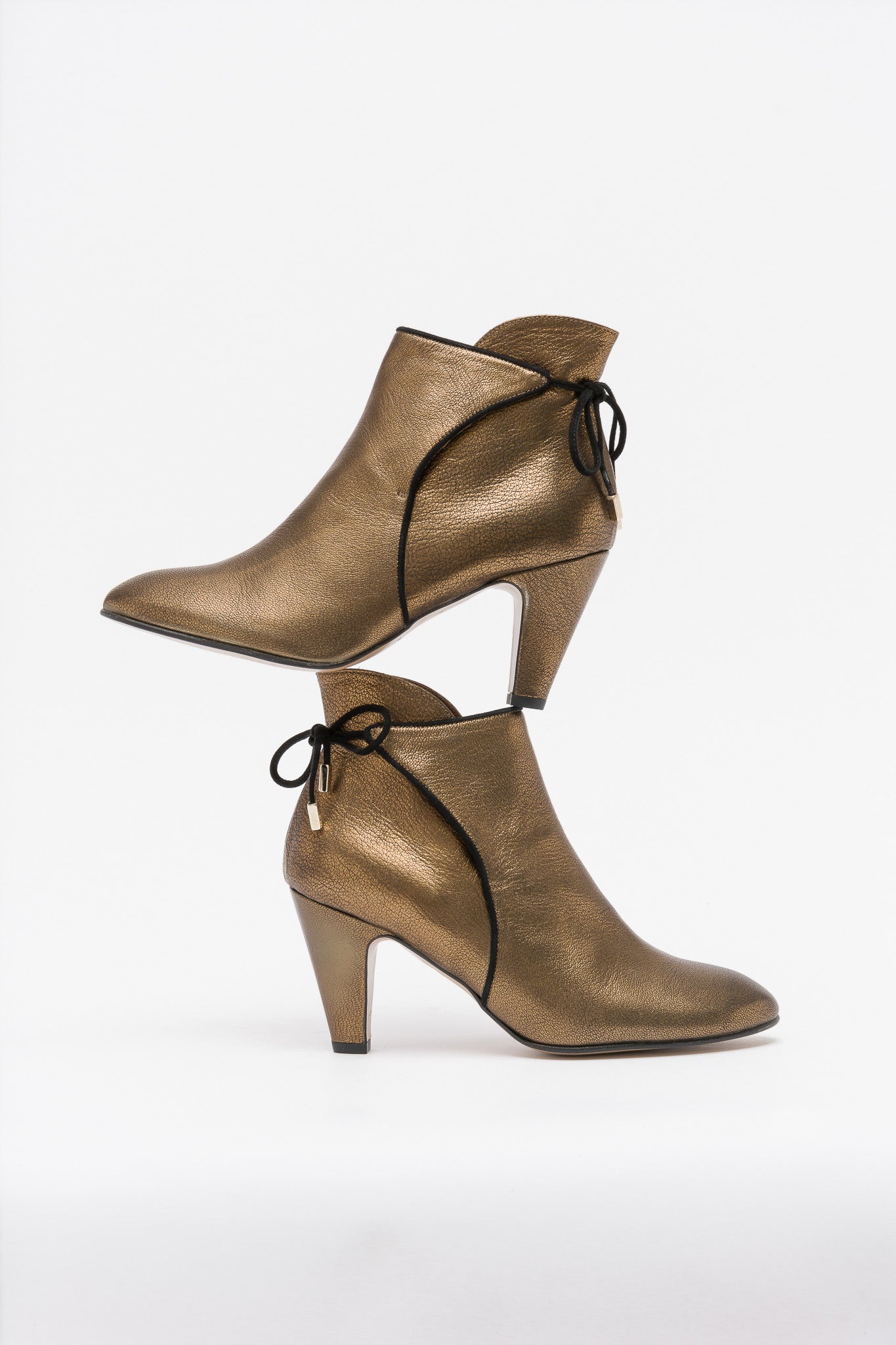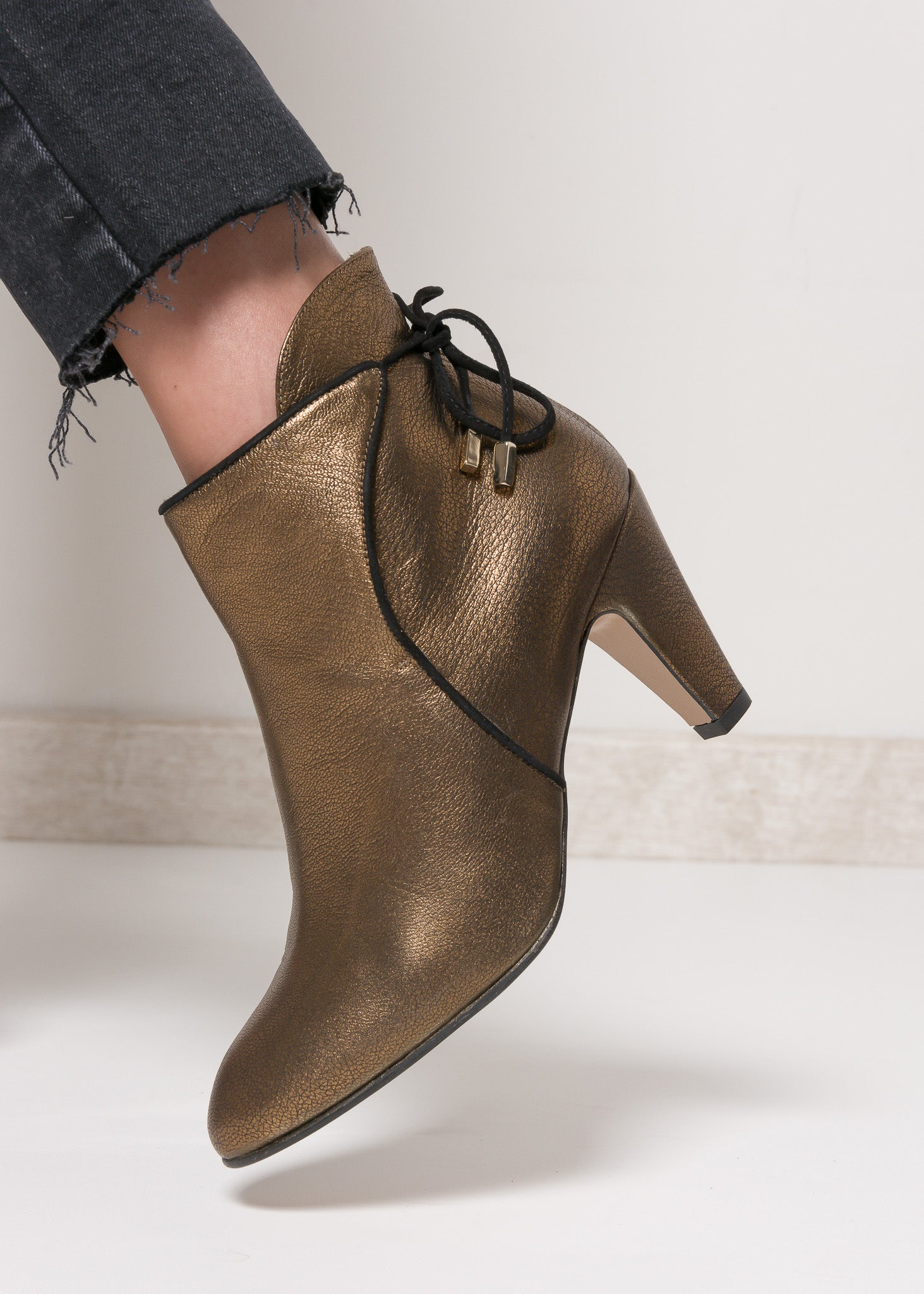 This foxy ankle bootie is designed on a classy round toe siloutte sitting on an elegant 6,5 cm slim covered heel.This combination of Florence is handcrafted in a copper metallic leather with a subtle black suede pipping detail and laces to fasten.Style them with your favourite pair of skinny jeans and a classic black leather biker jacket.