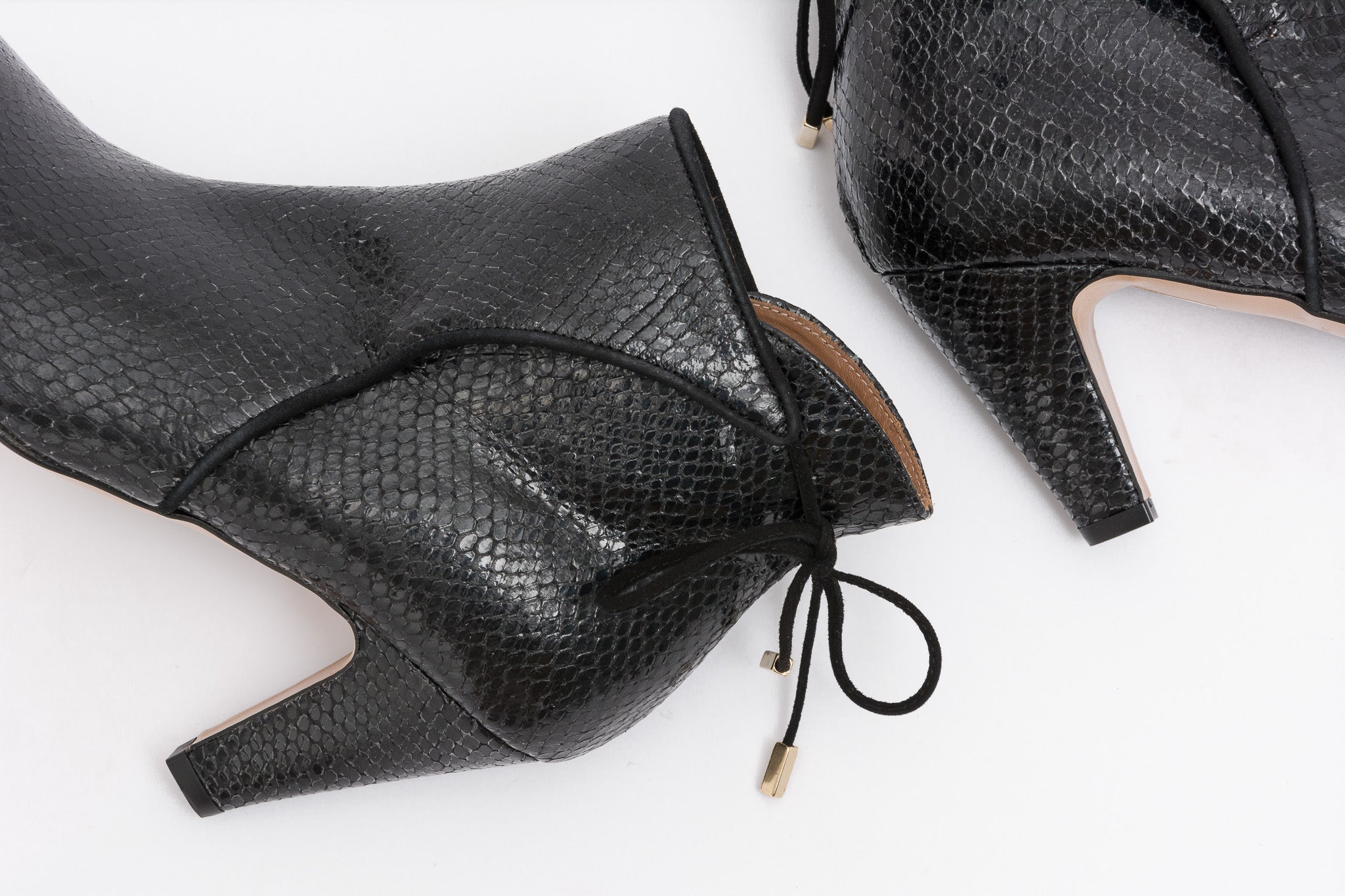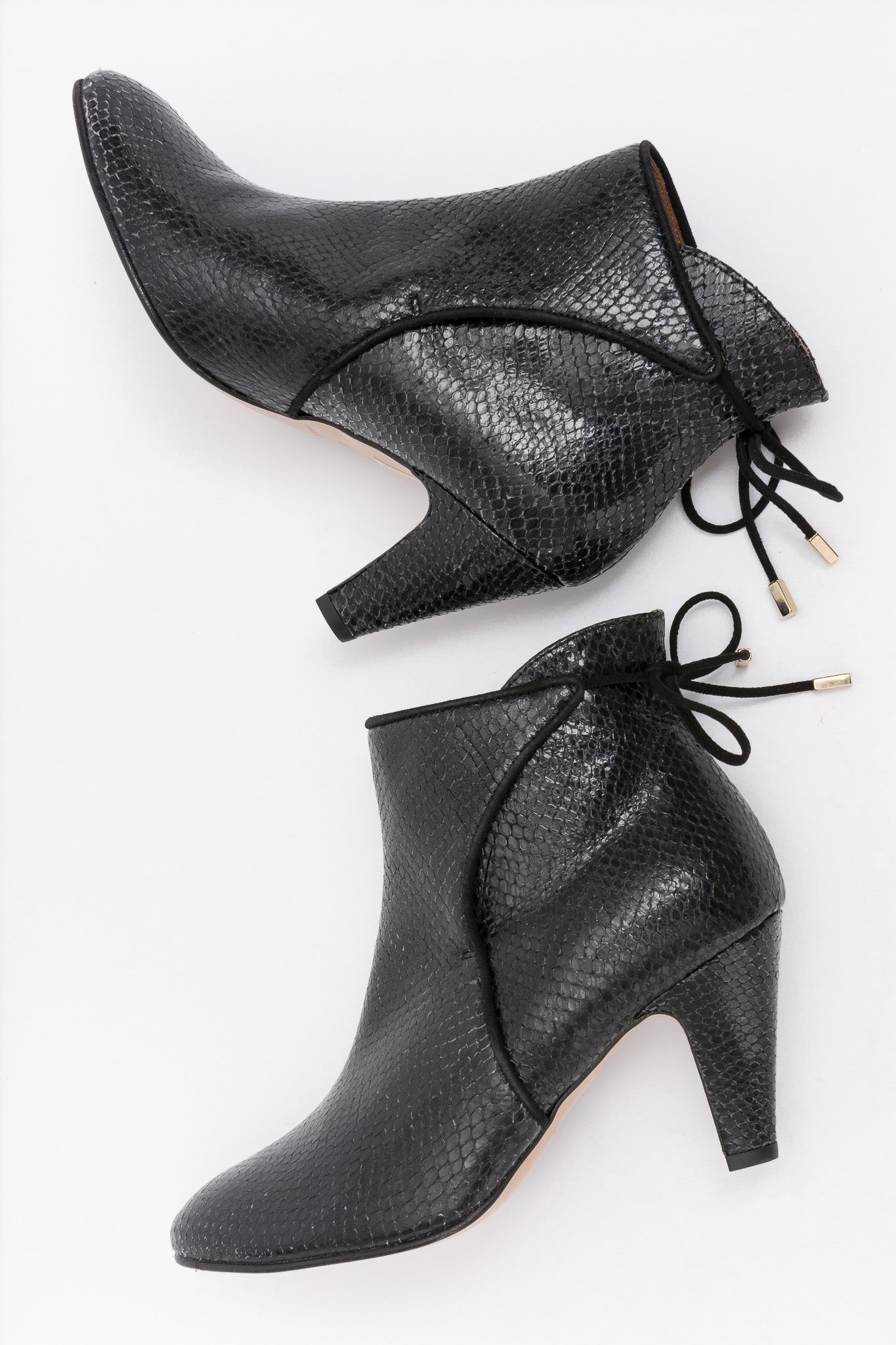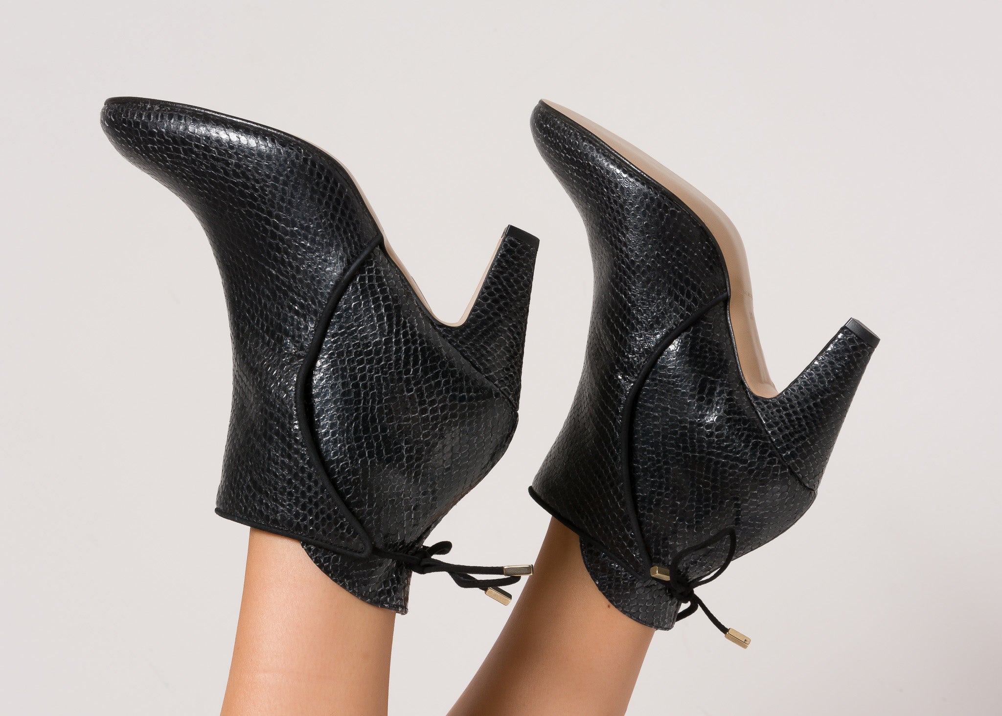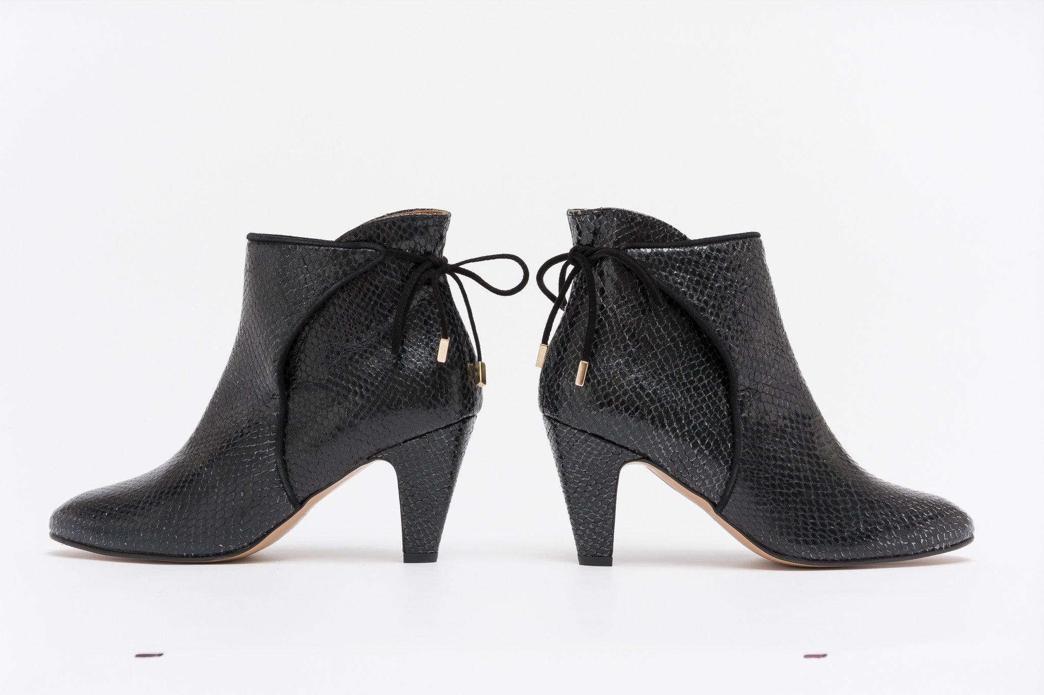 This foxy ankle bootie is designed on a classy round toe silhouette sitting on an elegant 6,5 cm slim covered heel.This combination of Florence is handcrafted in a snake embossed black leather with a subtle black suede pipping detail and laces to fasten.Style them with your favourite pair of skinny jeans and a classic black leather biker jacket.
