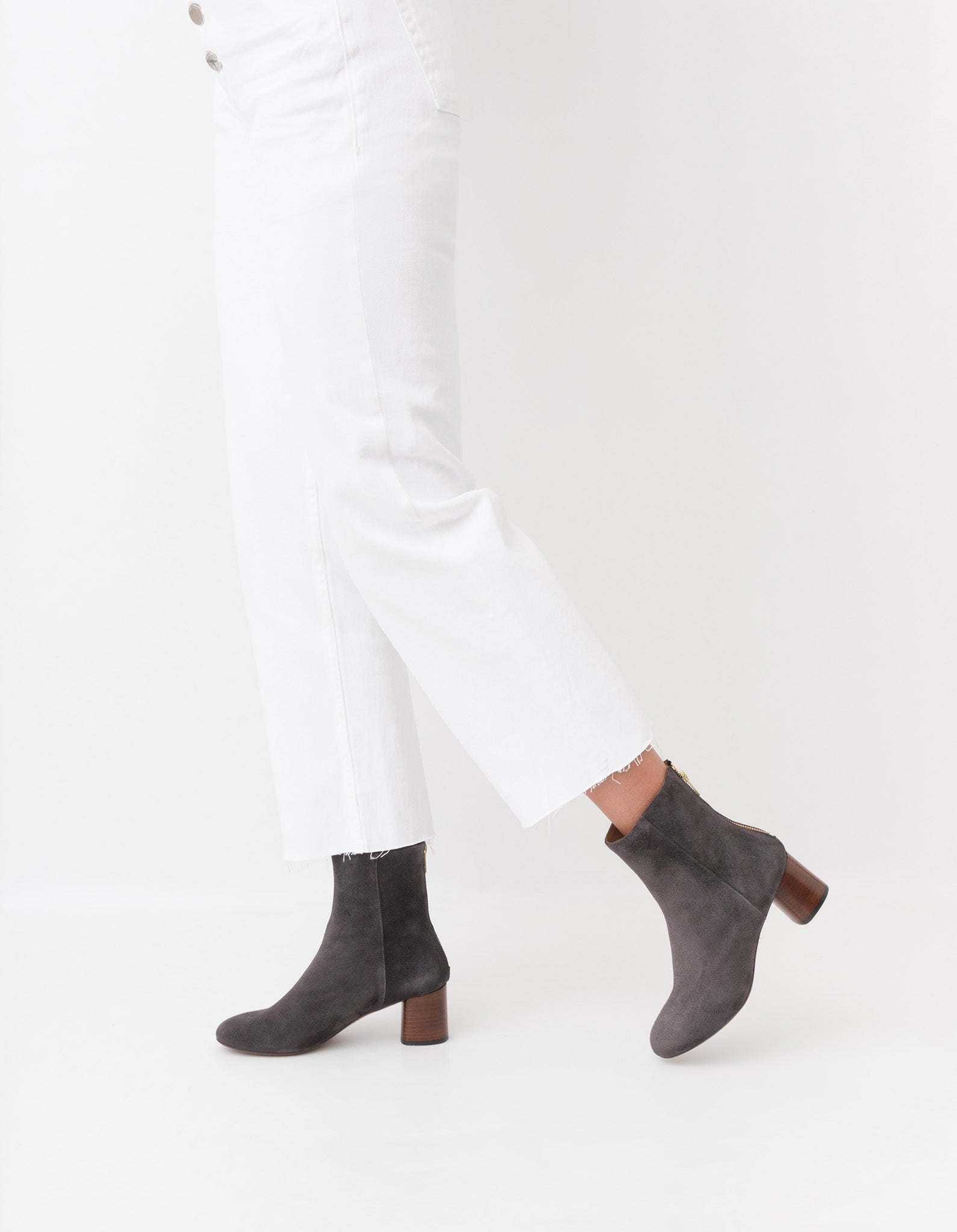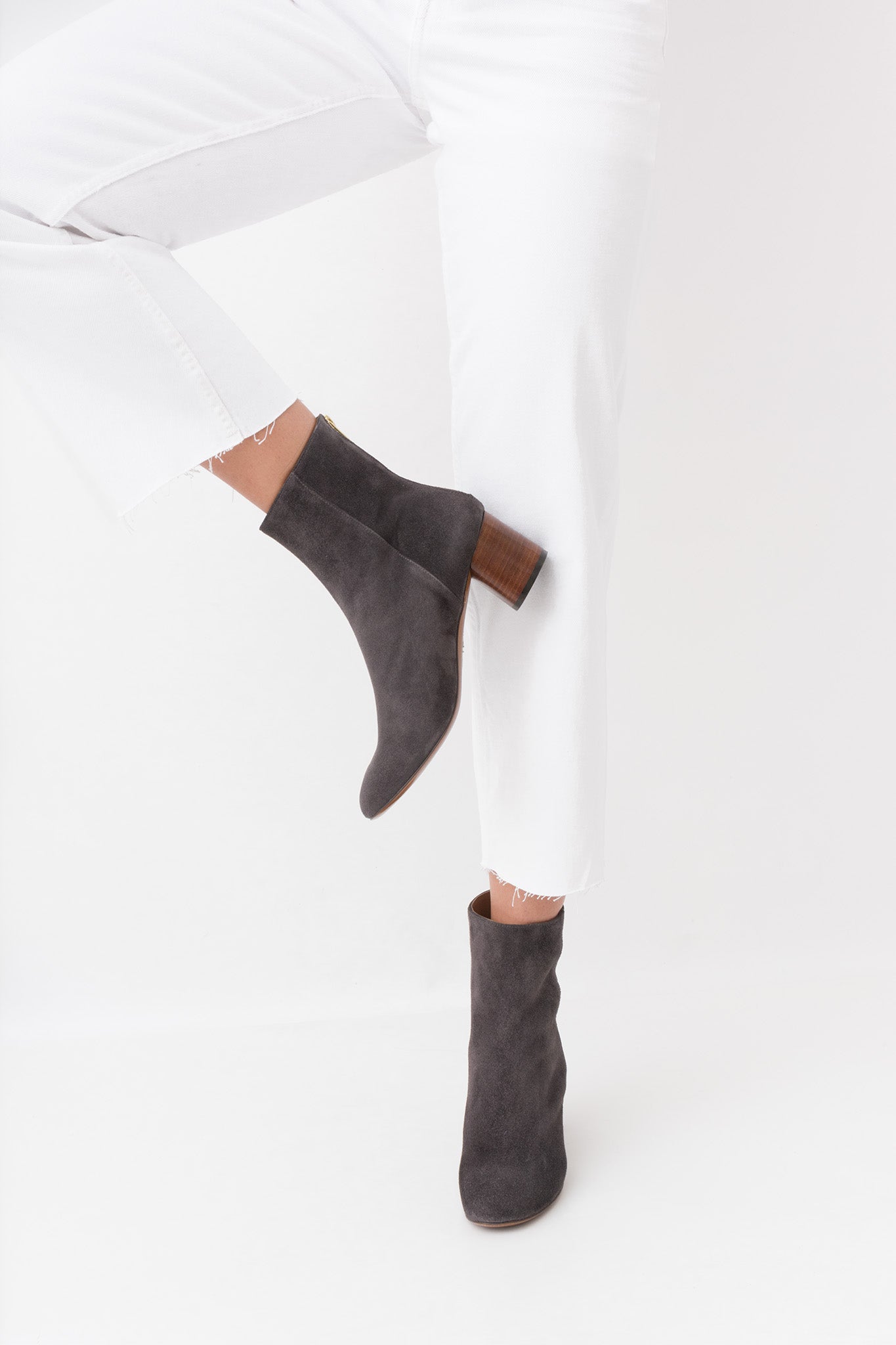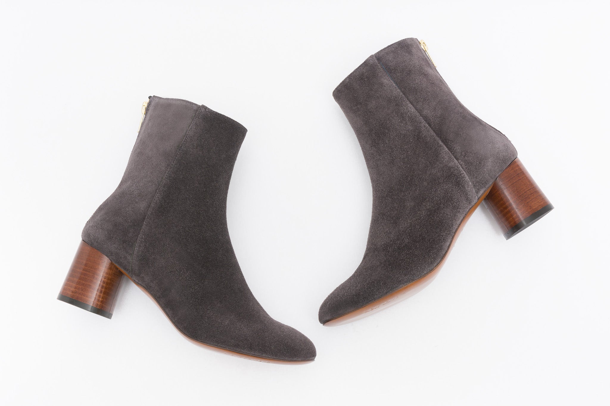 Gorka boots offer a super versatile silhouette with endless styling possibilities. Build on a constrating color stacked heel with a round toe and handcrafted on a smooth grey velour, will be a key style for your fall winter wardrobe.