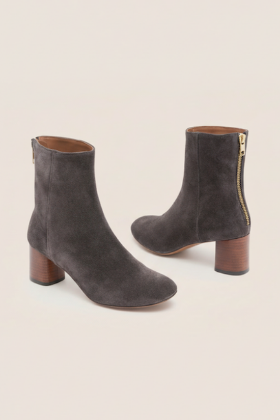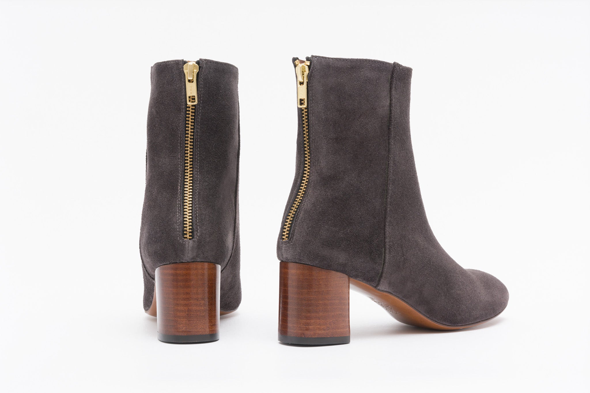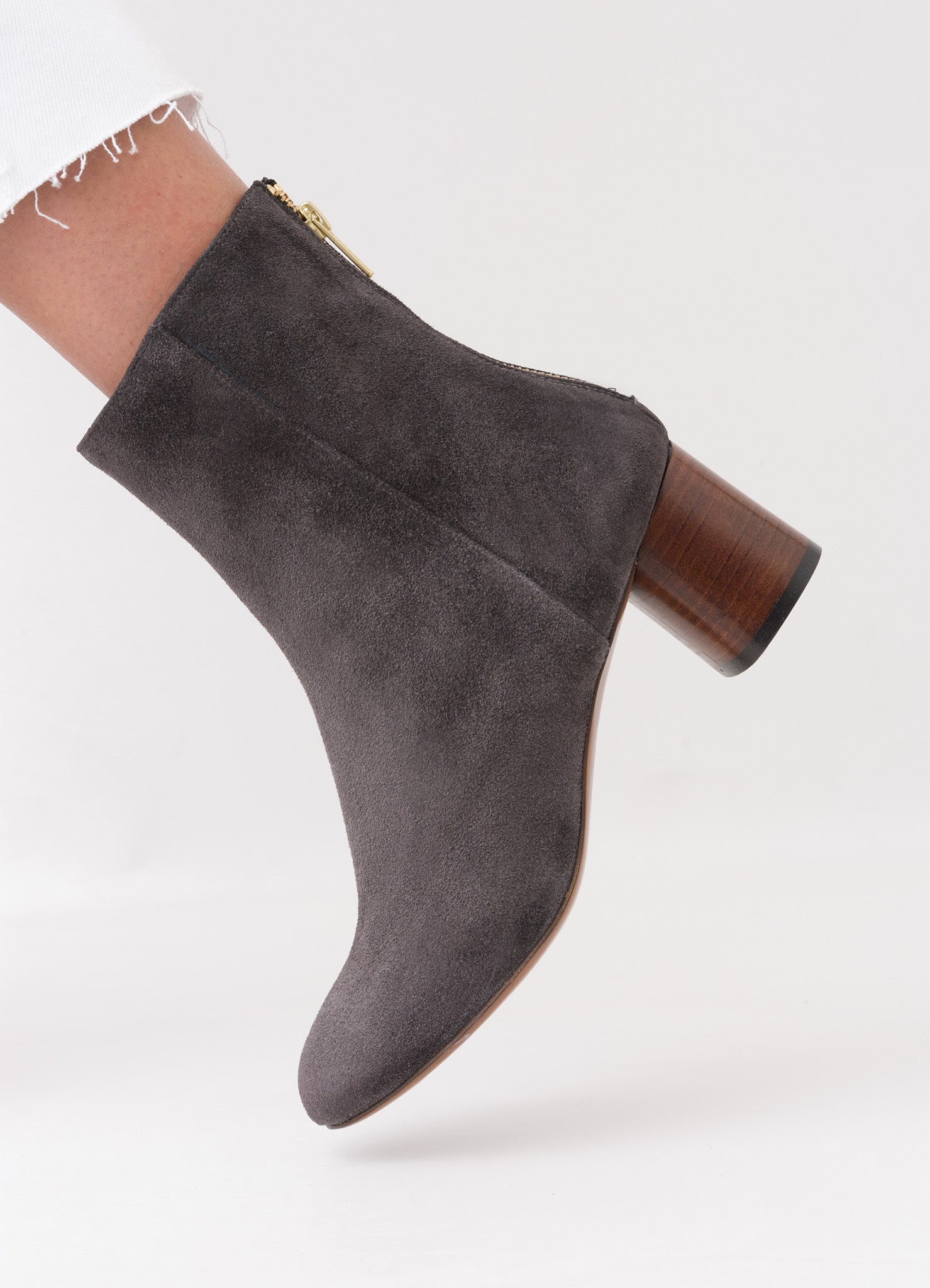 Gorka boots offer a super versatile silhouette with endless styling possibilities. Build on a constrating color stacked heel with a round toe and handcrafted on a smooth grey velour, will be a key style for your fall winter wardrobe.