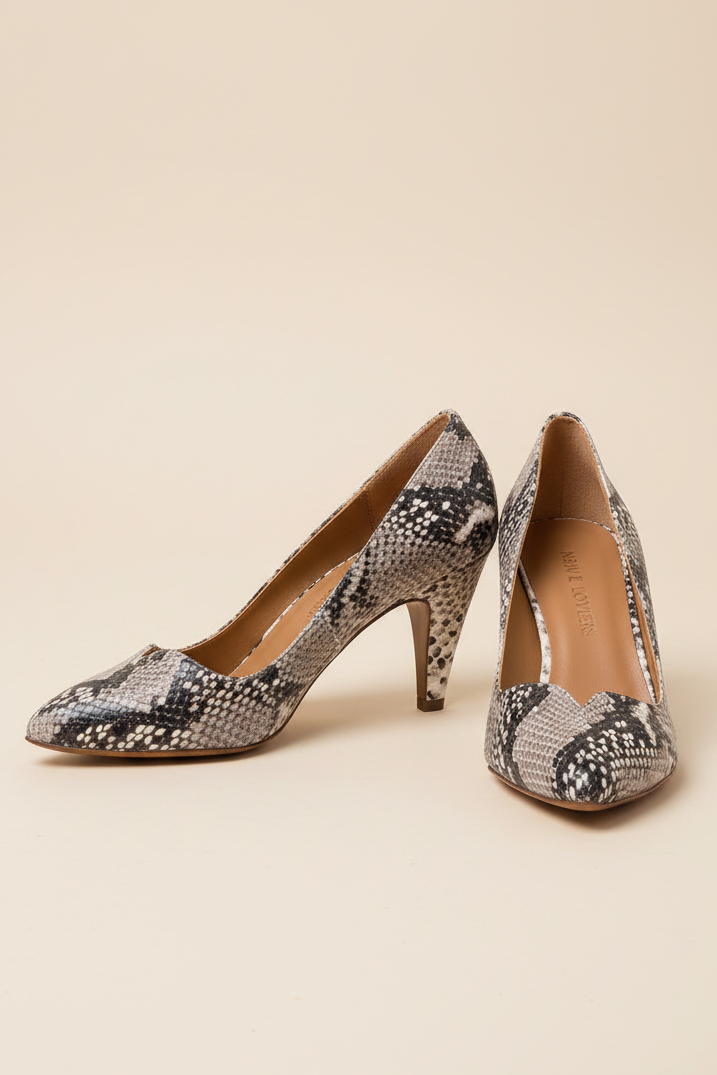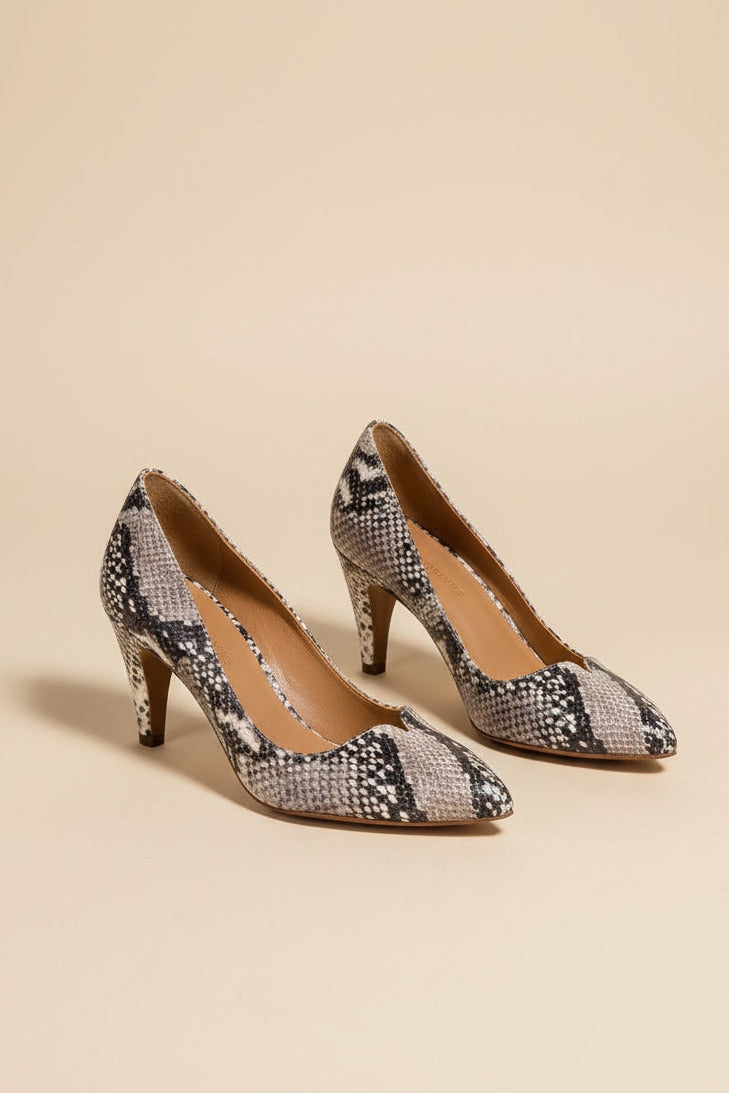 These 80's style pumps are our favorite this fall. Gwen is designed with a timeless pointed toe, a delicate heart-shaped vamp and a versatile heel. This reptile embossed leather is a fun alternative to classic black that's wearable and easy to combine.