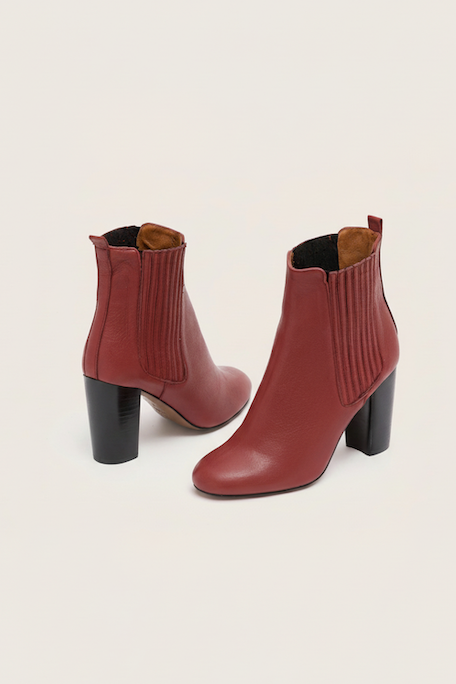A classic yet super vesatile high heel chelsea bootie in a supple carmine leather with a stacked thick cuban heel. Wear yours with a knit loose-cut sweater dress for a cool off-duty look.