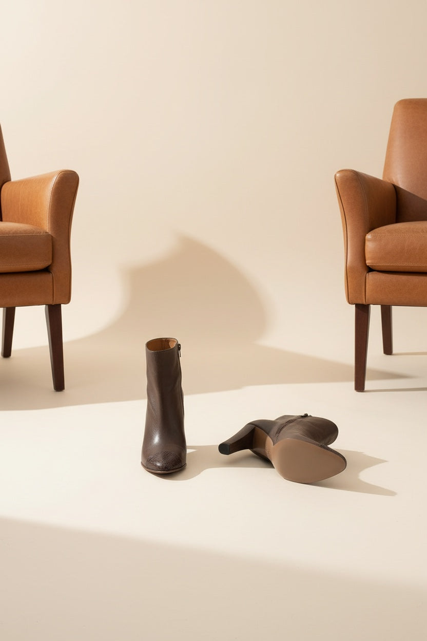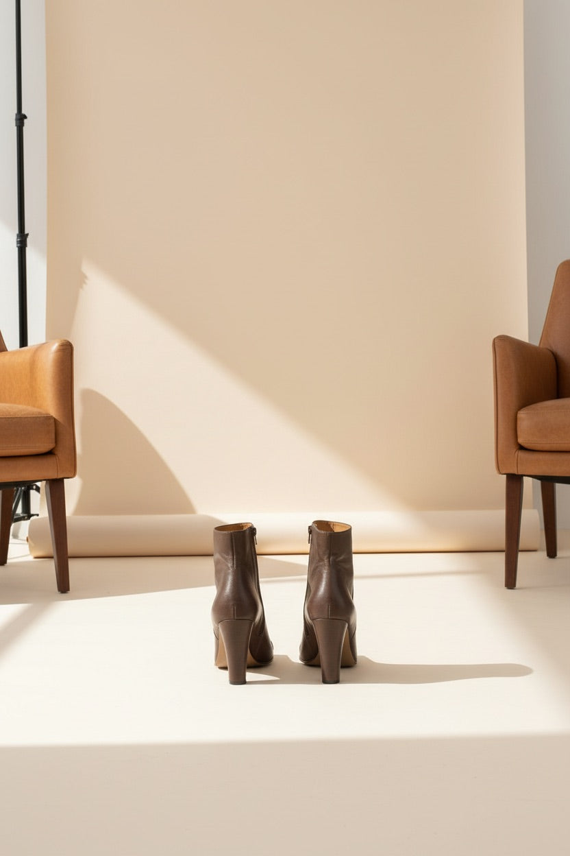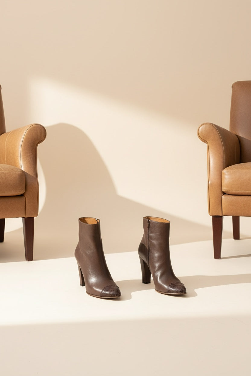 Timeless high block heeled ankle boot crafted in vegetable tanned brown leather, embellished with a tone in tone snake cap toe and a side metallic zip fastening. Match perfectly with a pair of cropped flare right above the ankle knit pants and a merino cashmere hoodie.