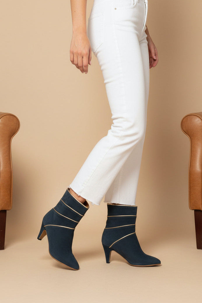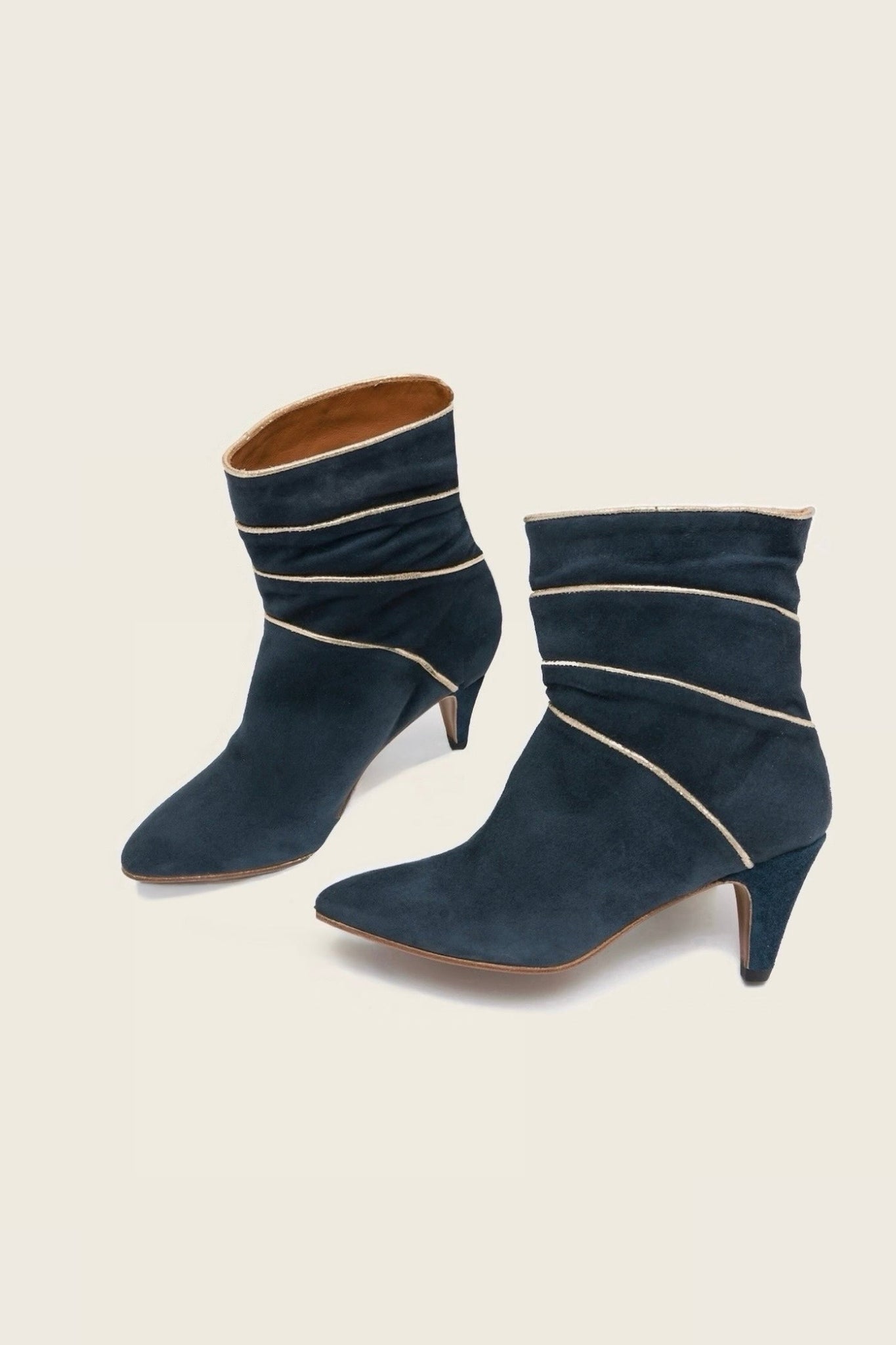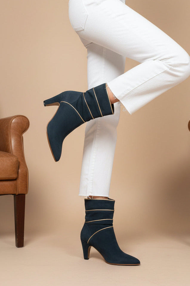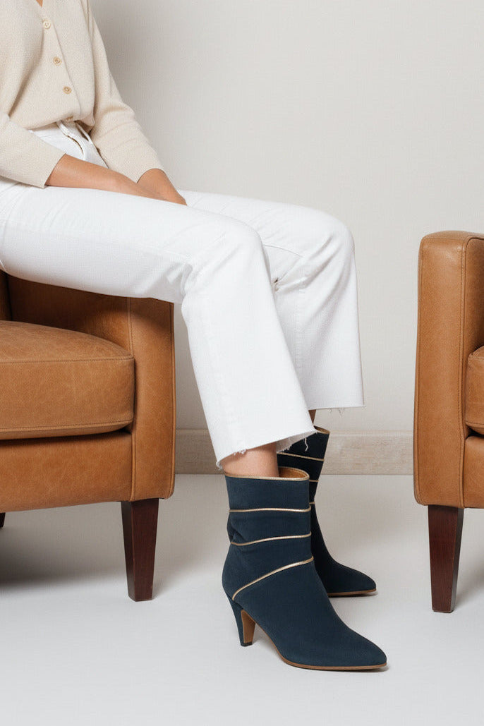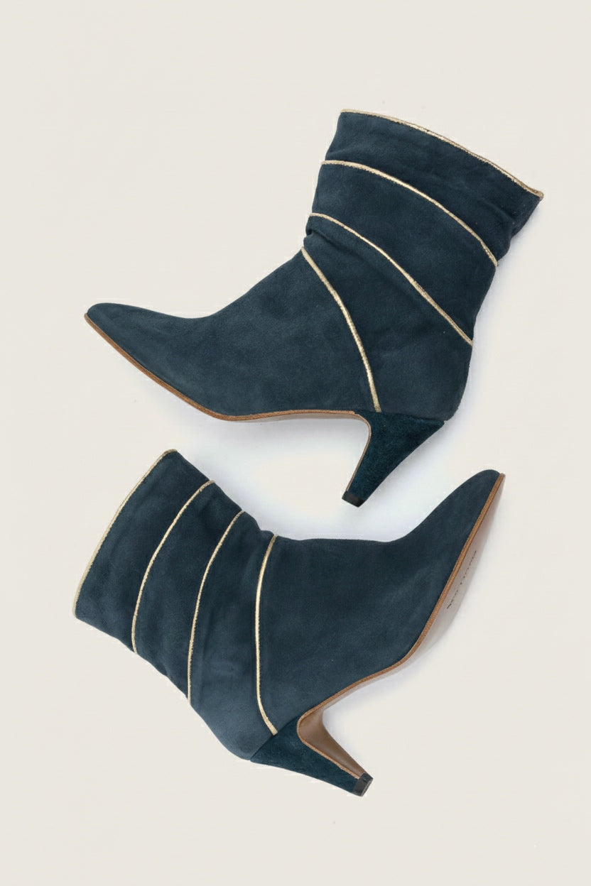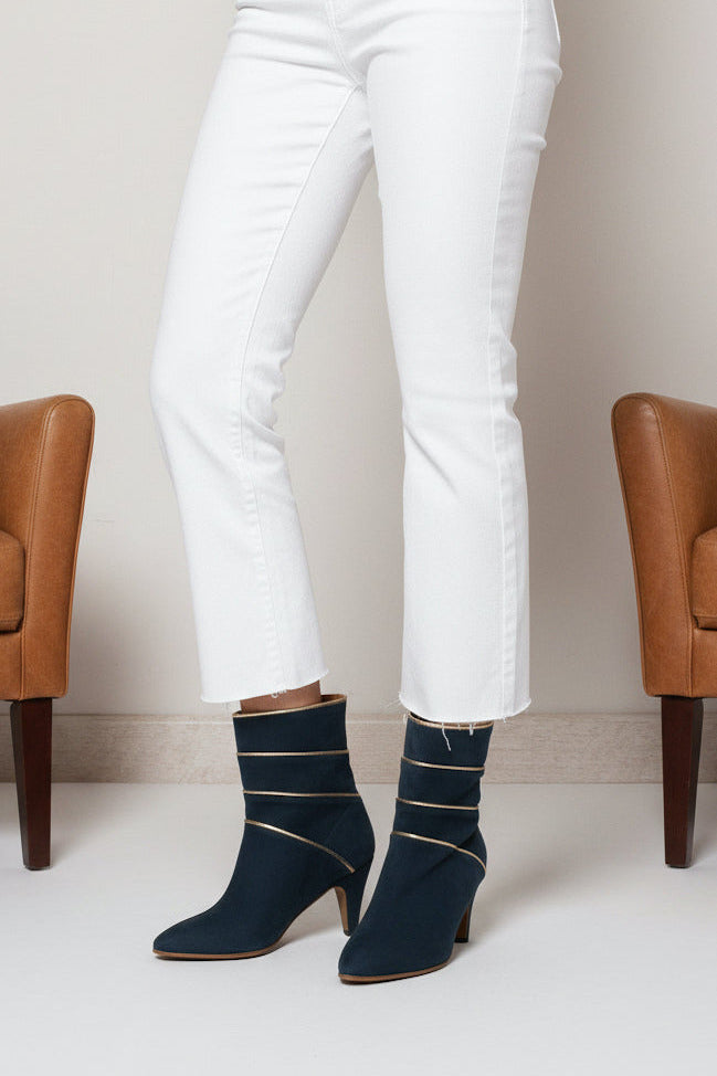 An 80’s-style blue pixie boot with metallic piping and a slim wrapped heel. Team up with skinny black jeans and a silk blouse for a sleek modern look.