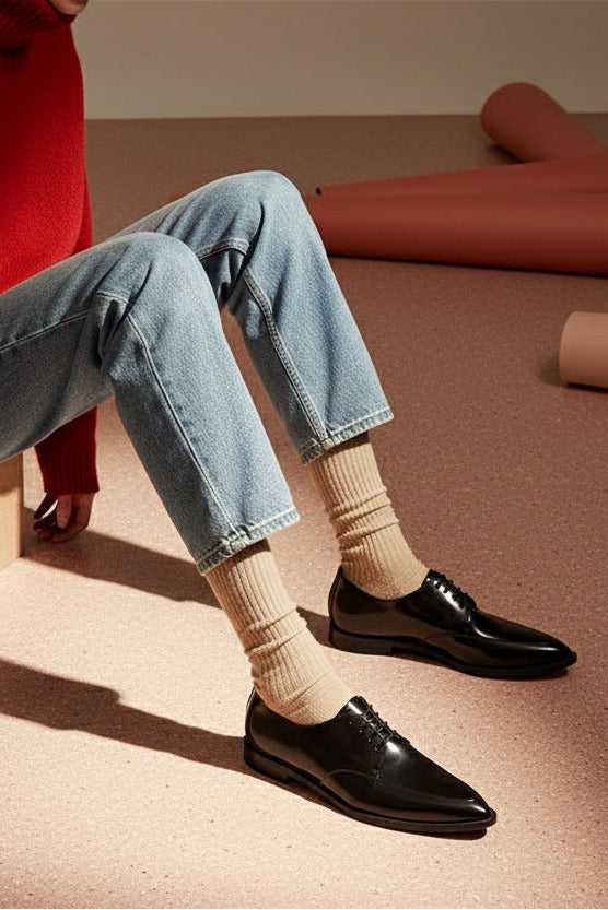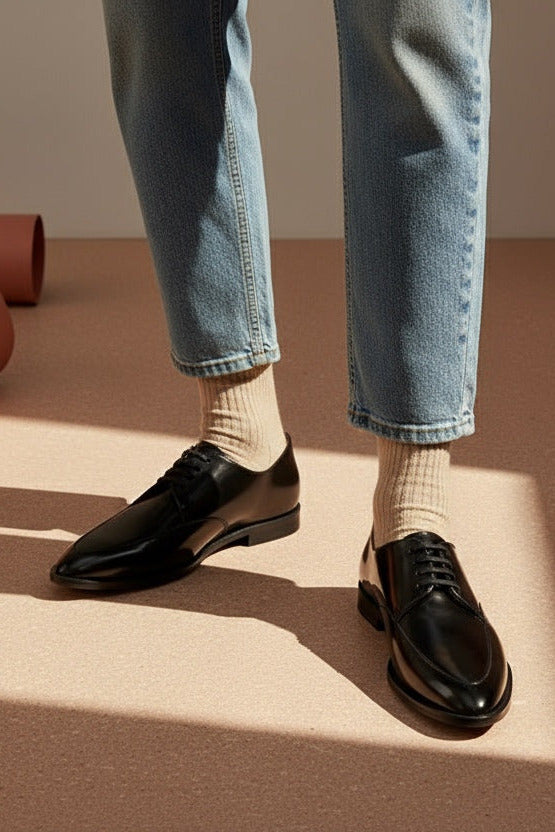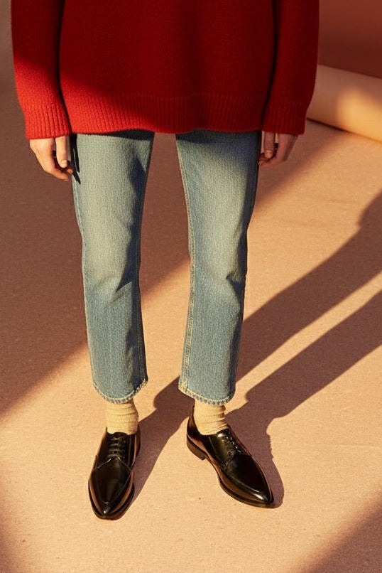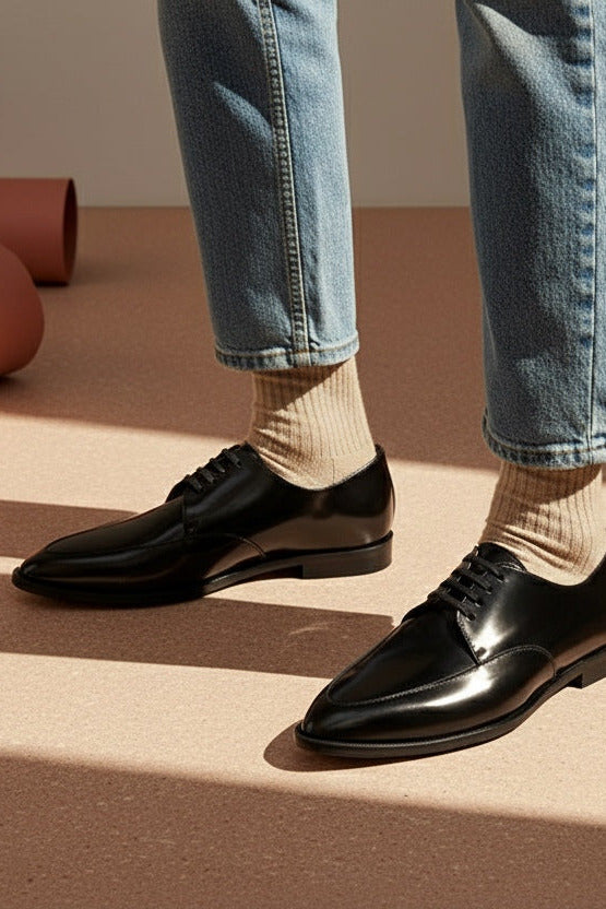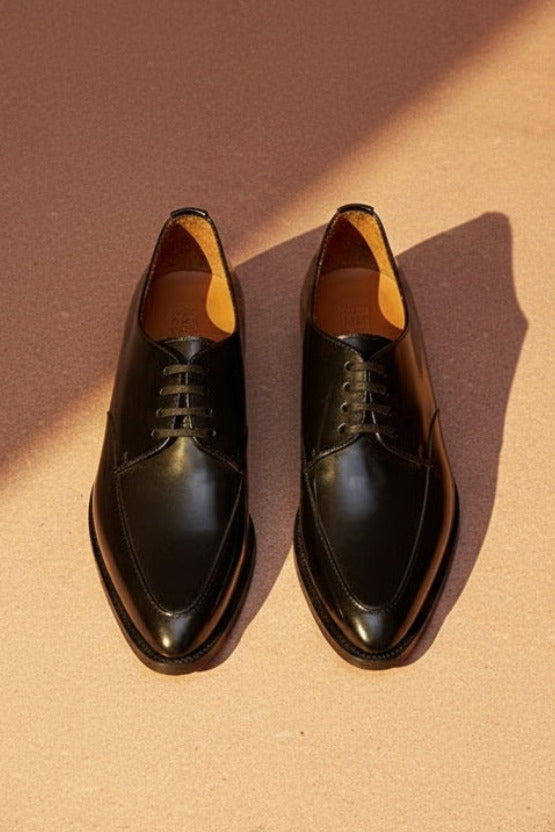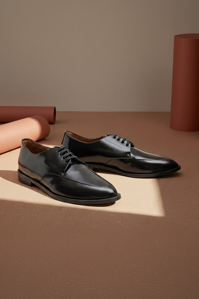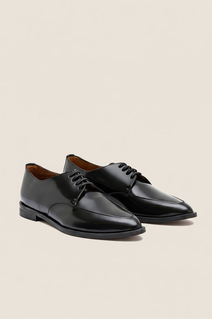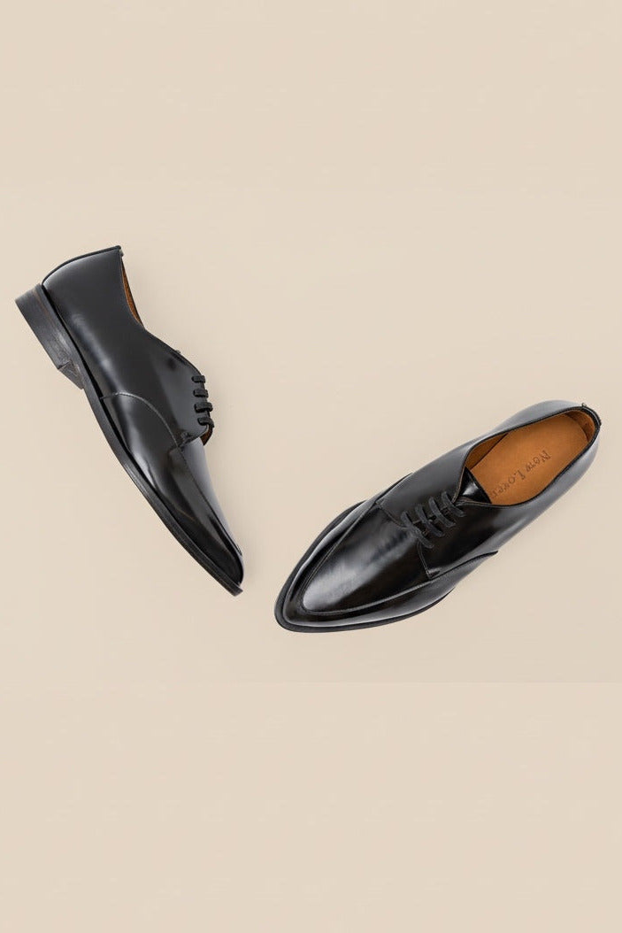 A classic derby in a polished black cordovan italian leather.This rock and roll styled shoe has an exquisite pointed toe providing a feminine touch to the design.A must piece for any contemporary footwear collection.