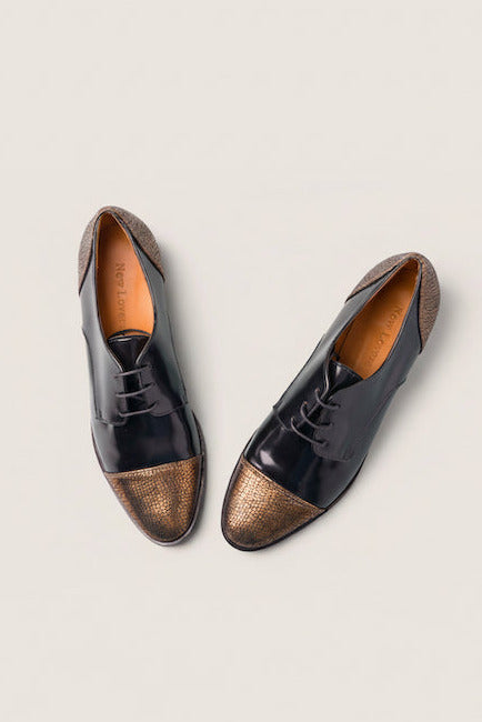 Premium cordovan leather brogue with a contrasting metallic toe and heel cap. A take on the men's classic, easy to wear all day.