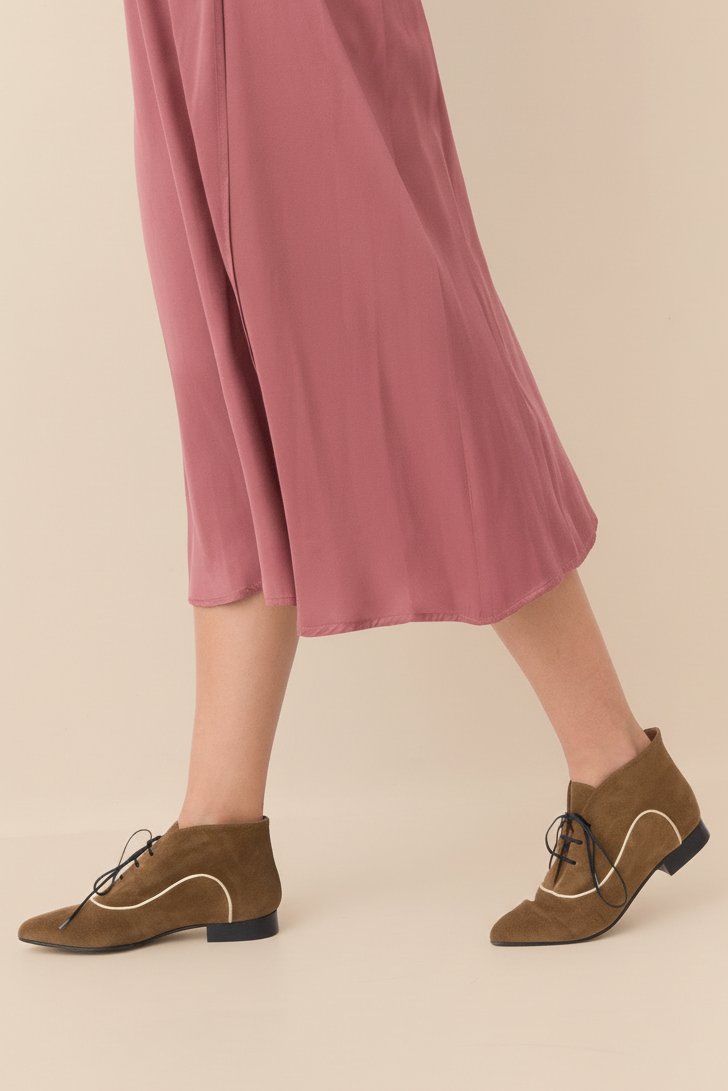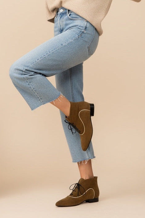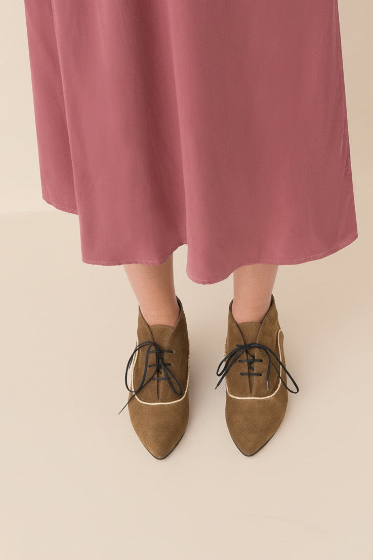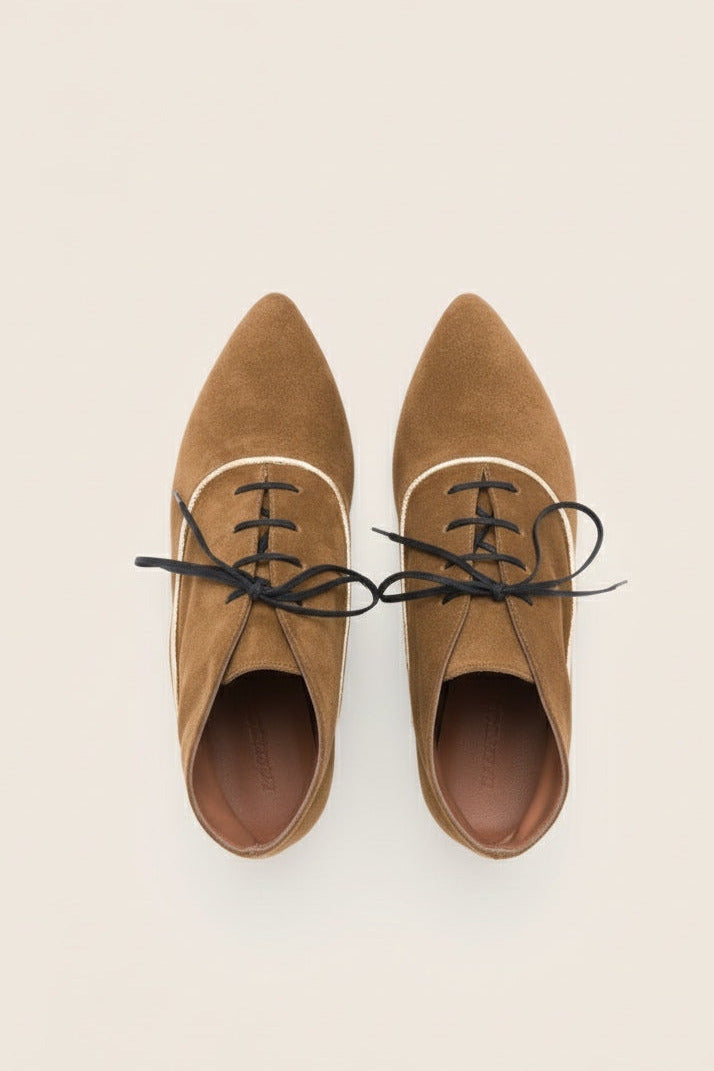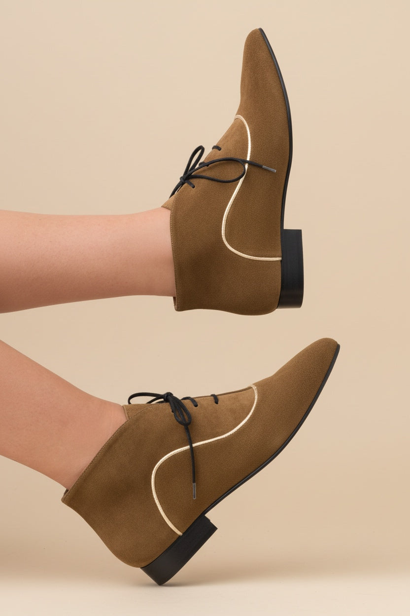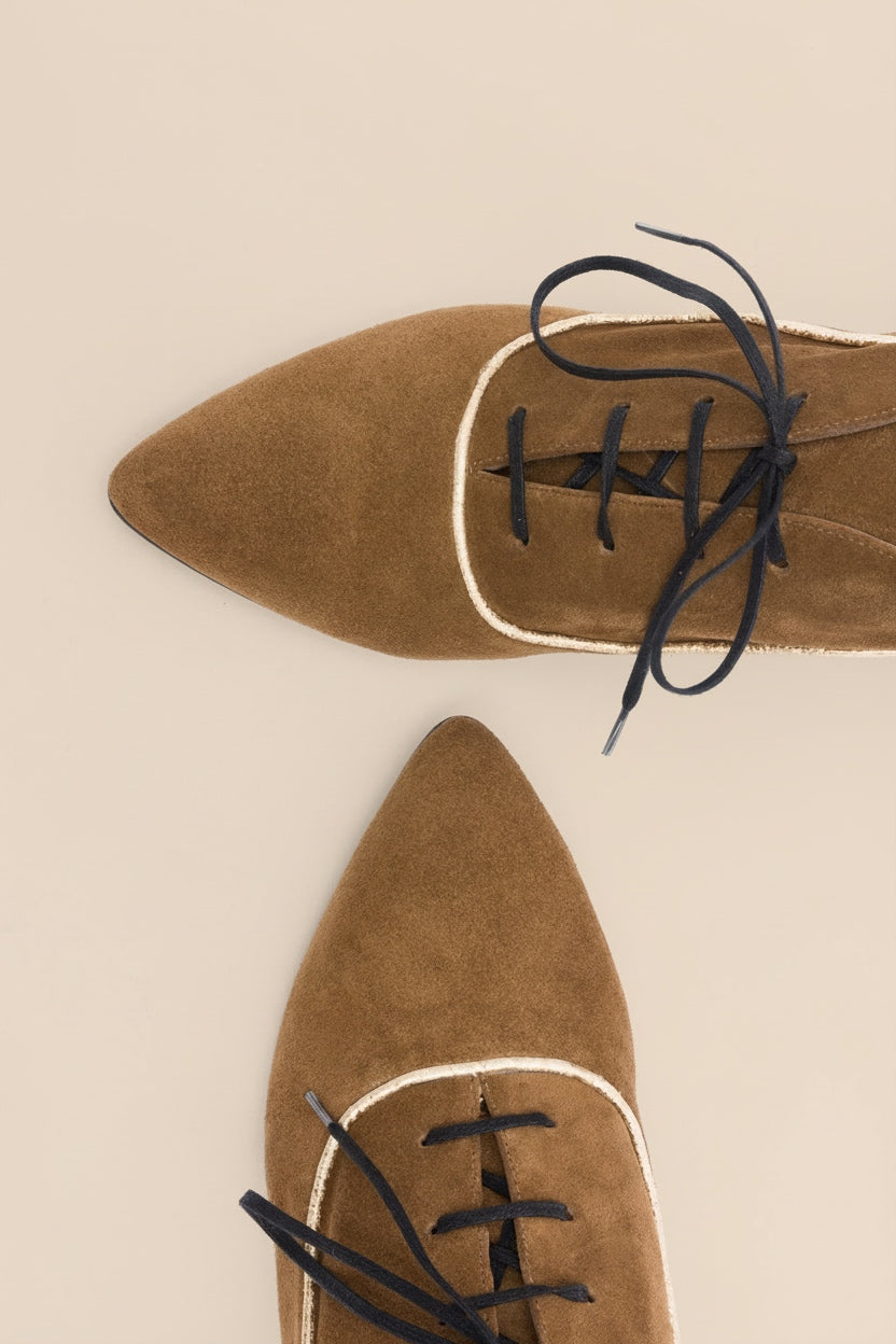 Give a girl the right shoes, and she'll conquer the world. Our Willow flat lace-ups are a super feminine version of the classic dessert boot. Featuring a pointy toe, a subtle gold pipping detail and lace-ups, this style will be your best ally to walk flat yet in style!