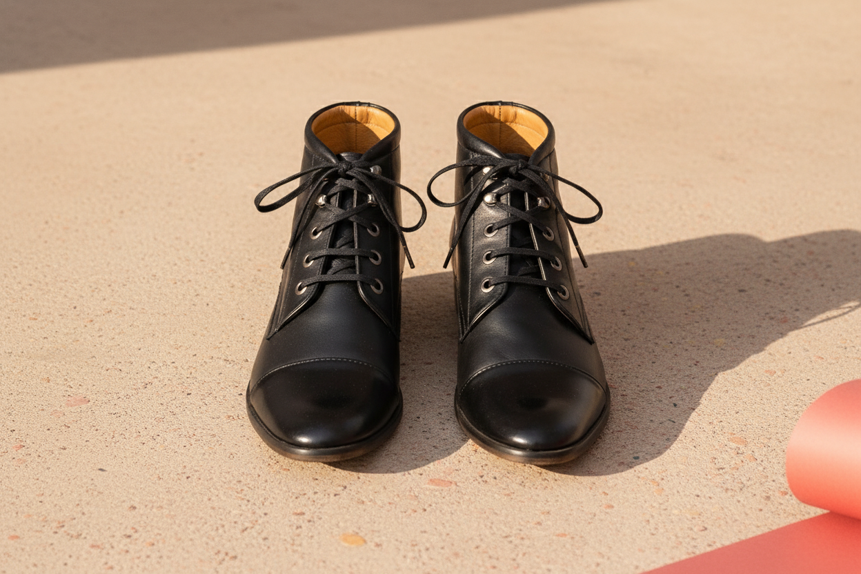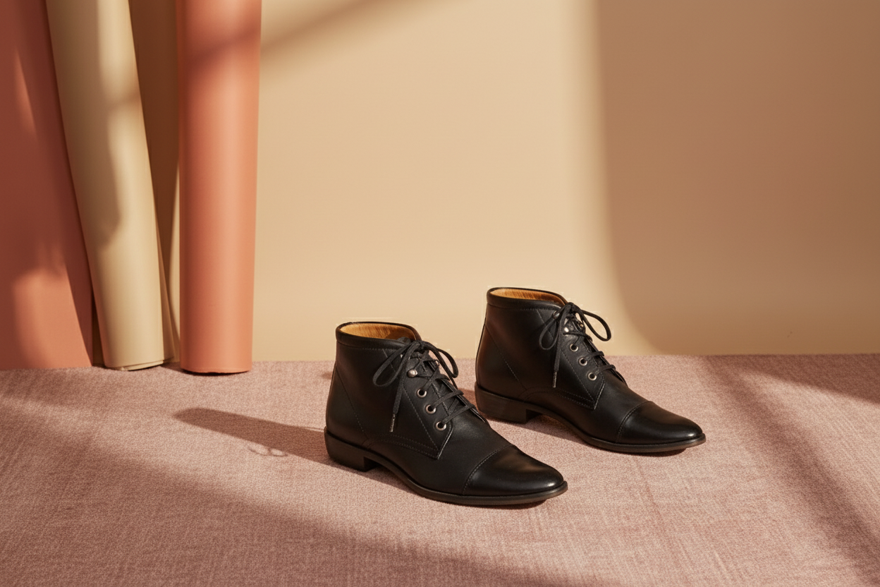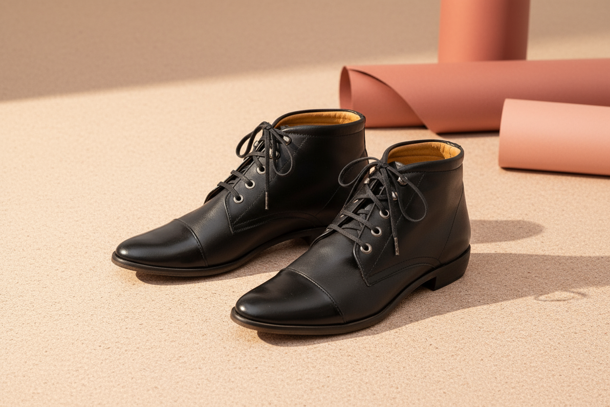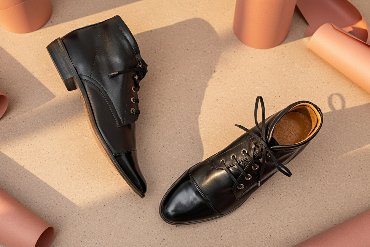 A classic desert boot design in smooth black leather with an almond cup toe on a chic cordoban leather handcrafted in Spain. Styled with a polished toe cap and metal shoelace tips for a unique design with an edge.
