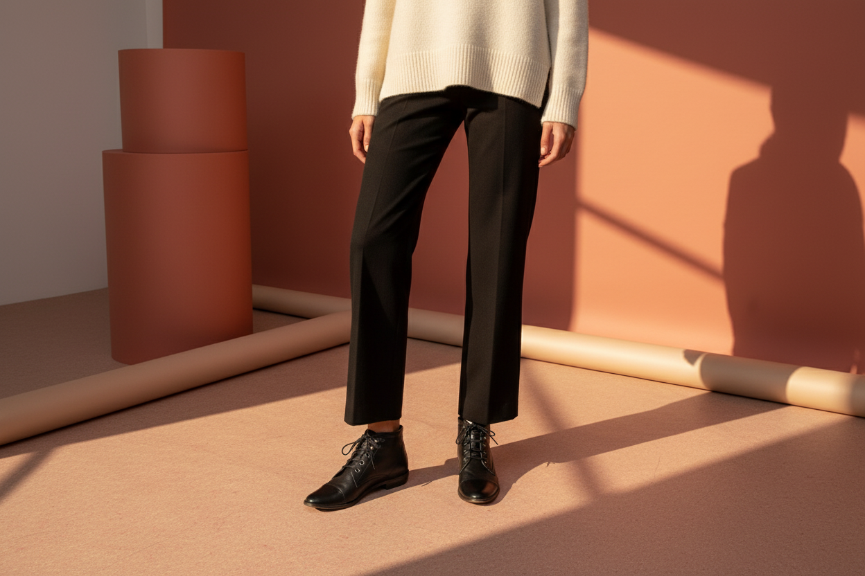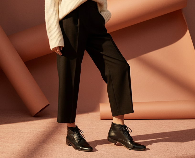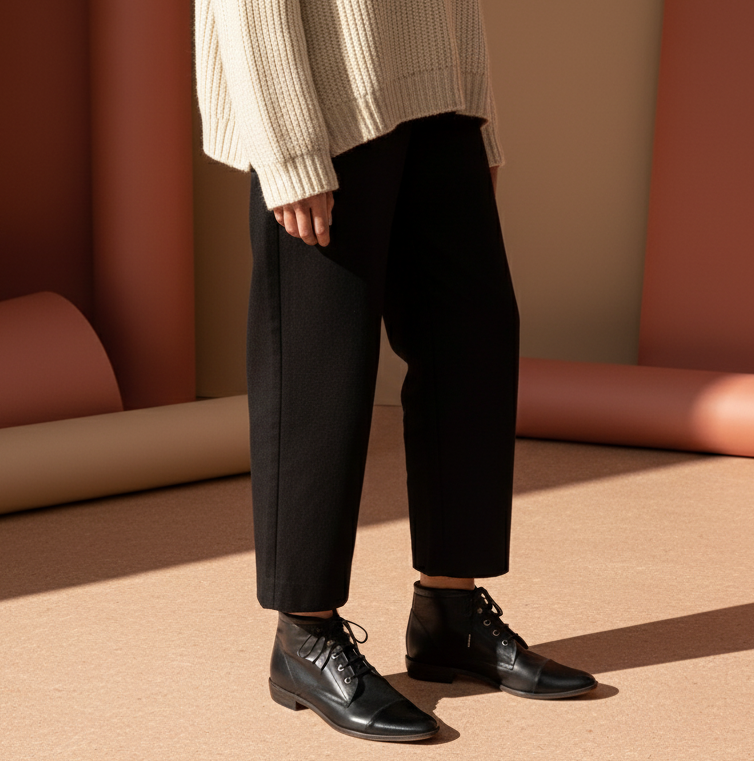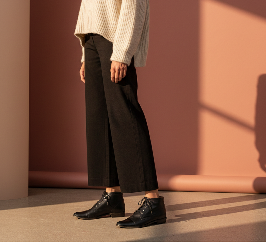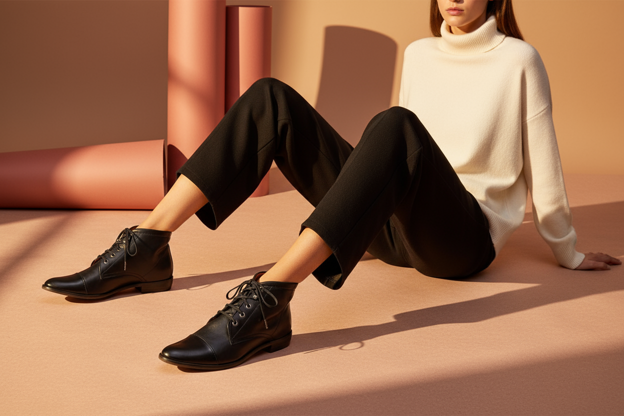 A classic desert boot design in smooth black leather with an almond cup toe on a chic cordoban leather handcrafted in Spain. Styled with a polished toe cap and metal shoelace tips for a unique design with an edge.