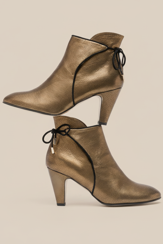 This foxy ankle bootie is designed on a classy round toe siloutte sitting on an elegant 6,5 cm slim covered heel.This combination of Florence is handcrafted in a copper metallic leather with a subtle black suede pipping detail and laces to fasten.Style them with your favourite pair of skinny jeans and a classic black leather biker jacket.