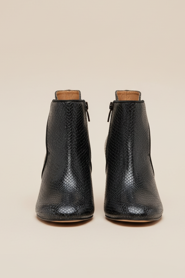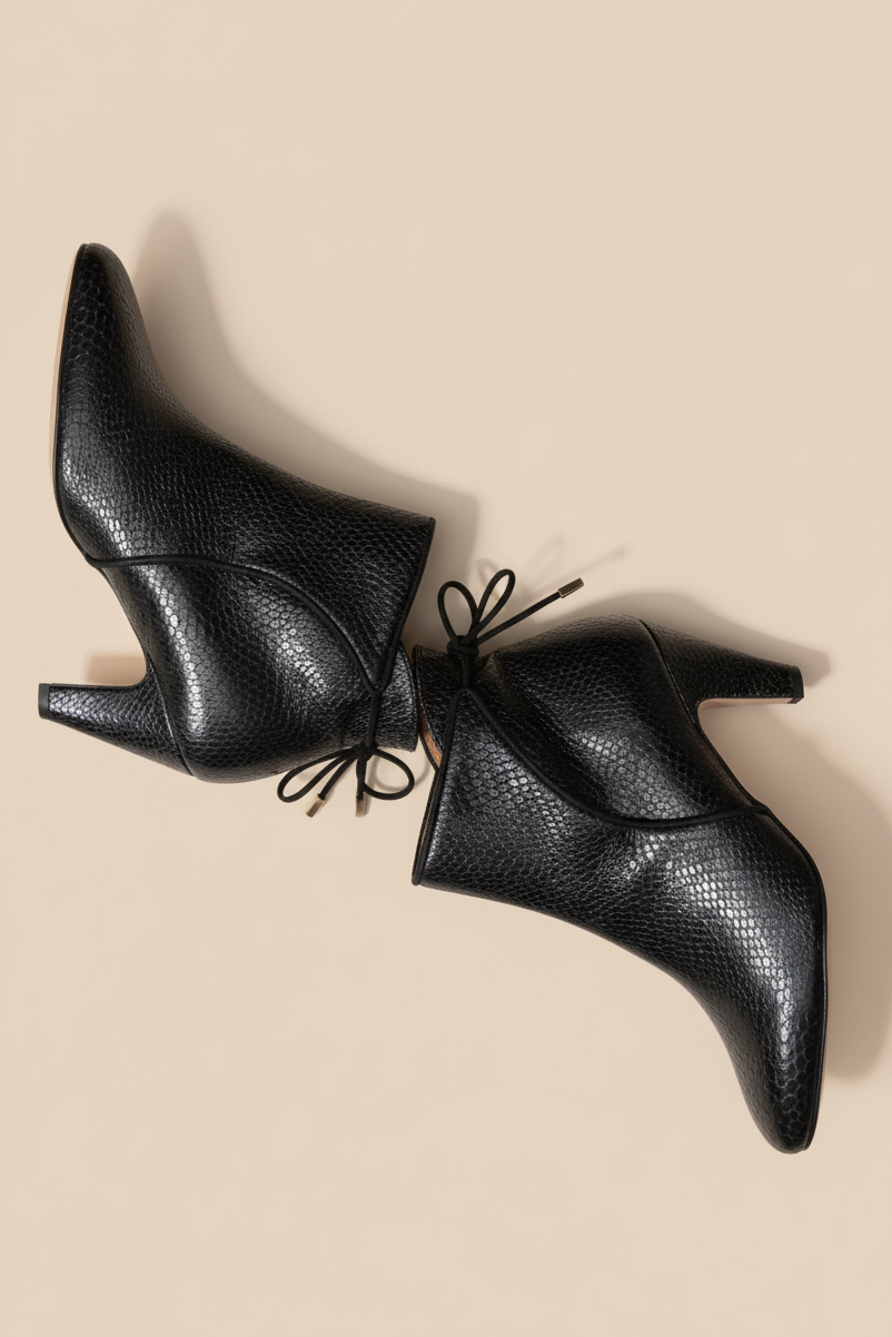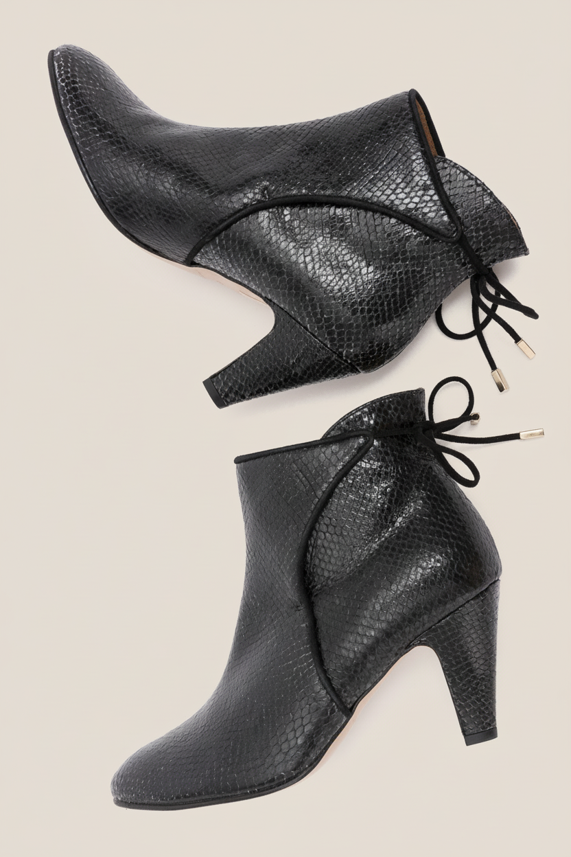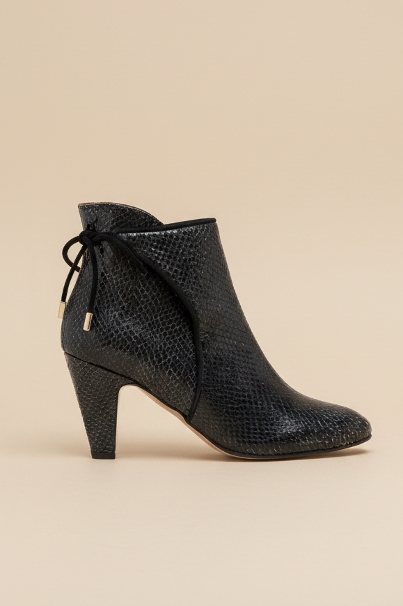 This foxy ankle bootie is designed on a classy round toe silhouette sitting on an elegant 6,5 cm slim covered heel.This combination of Florence is handcrafted in a snake embossed black leather with a subtle black suede pipping detail and laces to fasten.Style them with your favourite pair of skinny jeans and a classic black leather biker jacket.