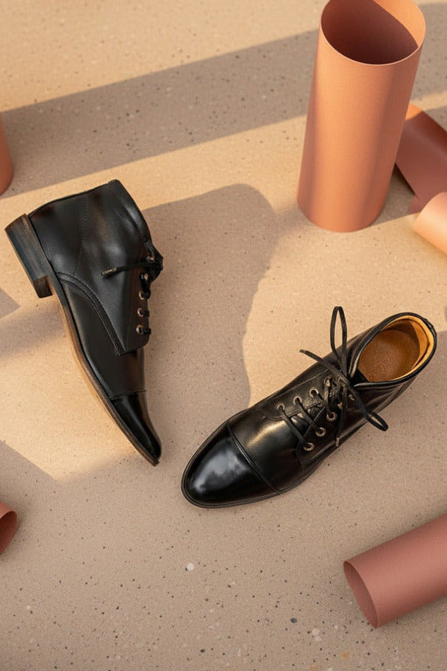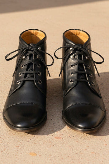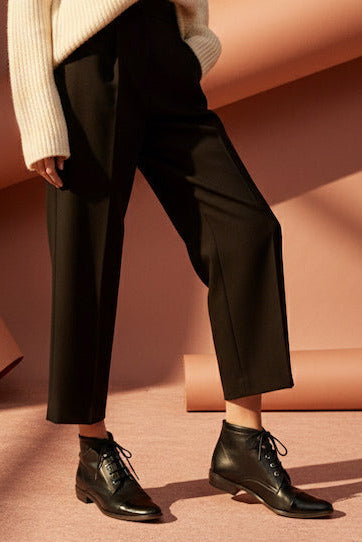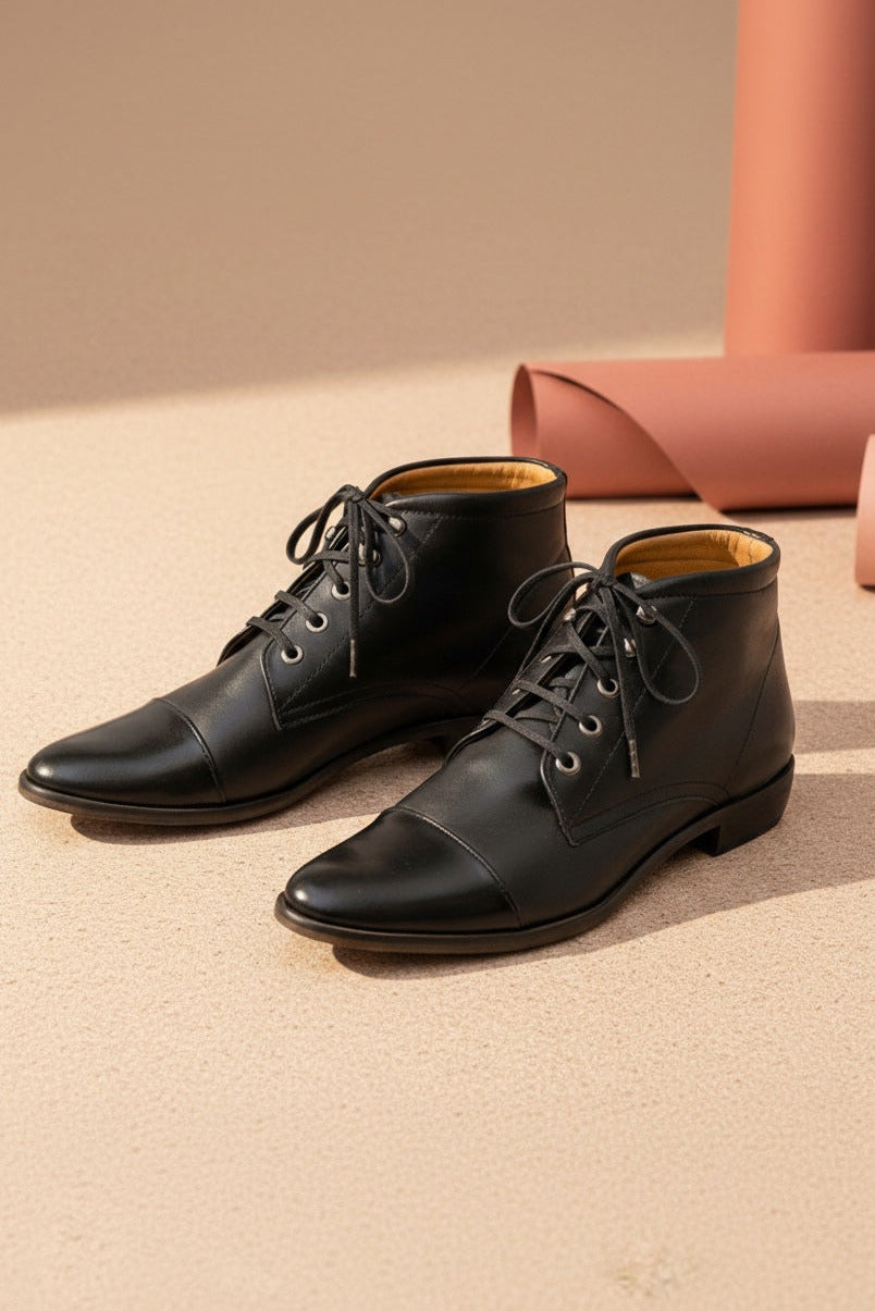A classic desert boot design in smooth black leather with an almond cup toe on a chic cordoban leather handcrafted in Spain. Styled with a polished toe cap and metal shoelace tips for a unique design with an edge.