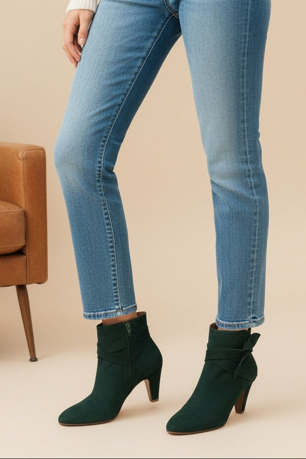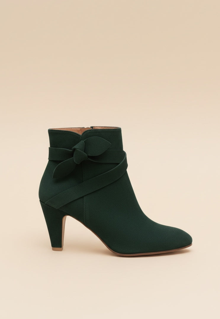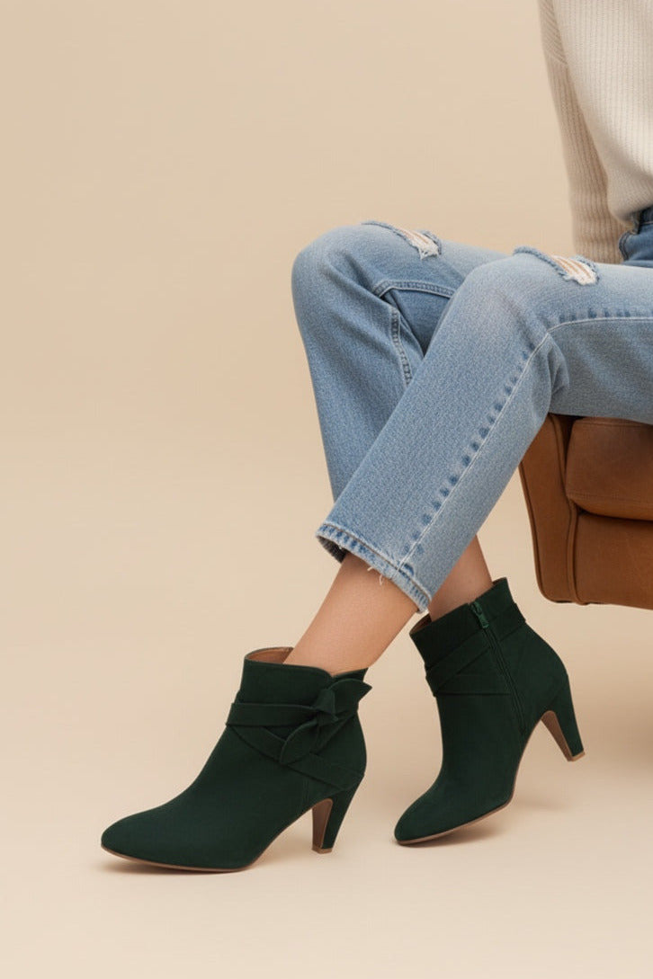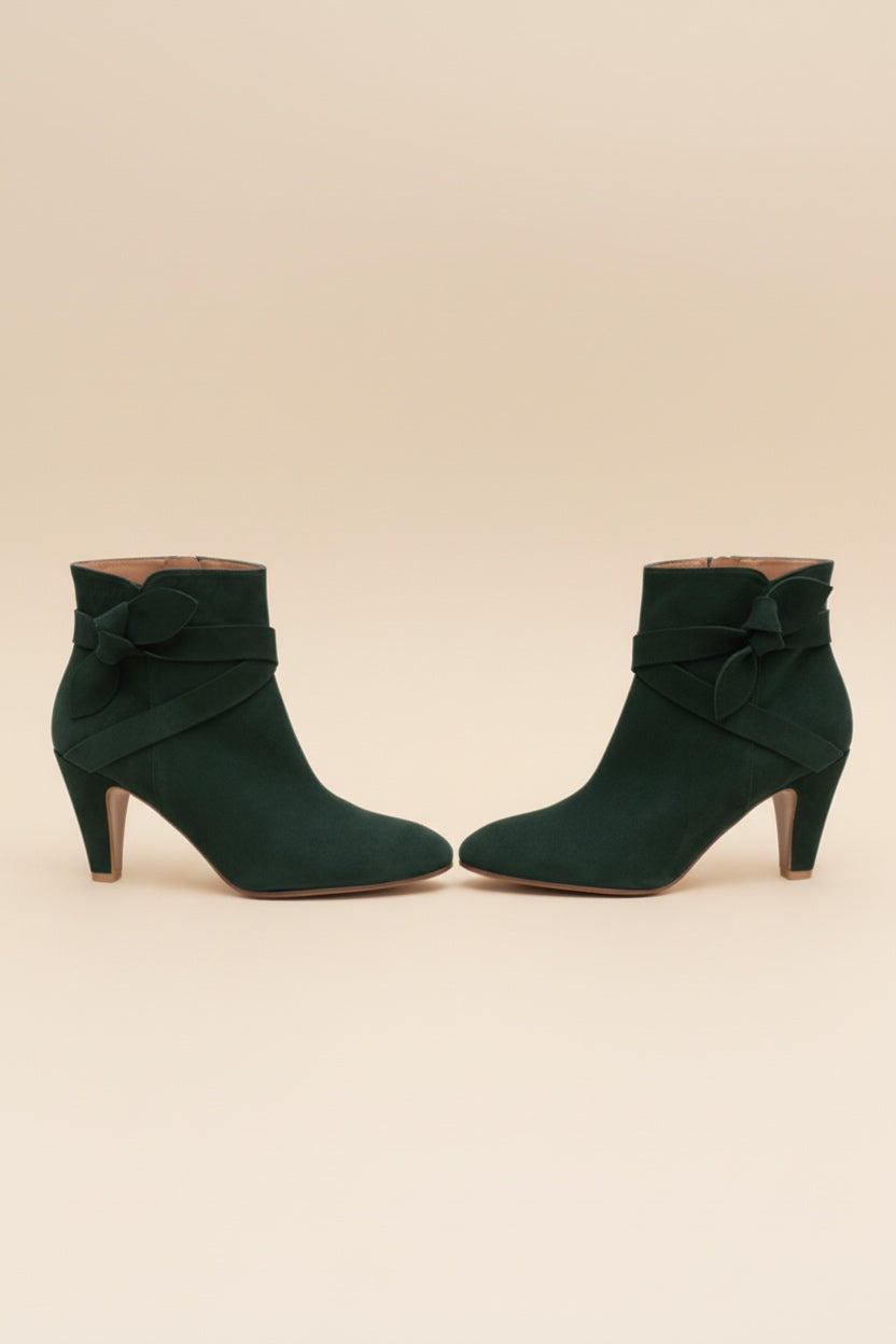 A stylish bootie designed on a classic round almond toe shape with a front crossed strap-ankle and a decorative side bow, interior side zip and slim covered heel. Style this green basil suede combination of Olvera boots with black tights and a wool sweater maxi dress.