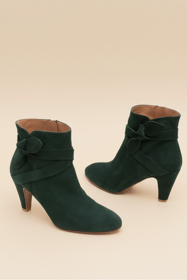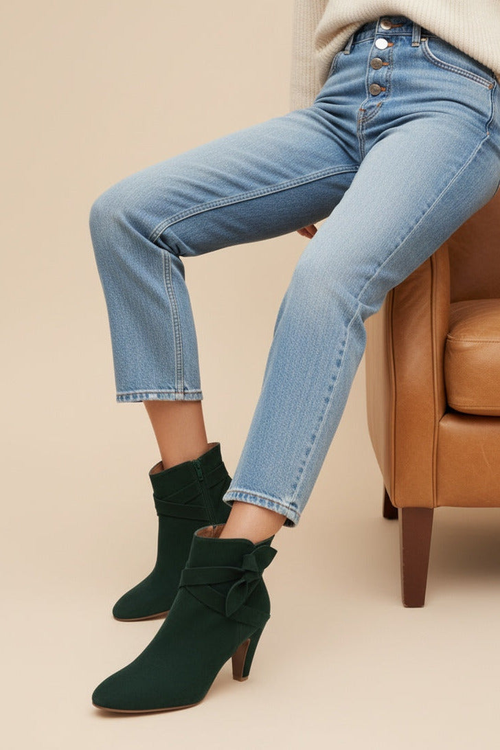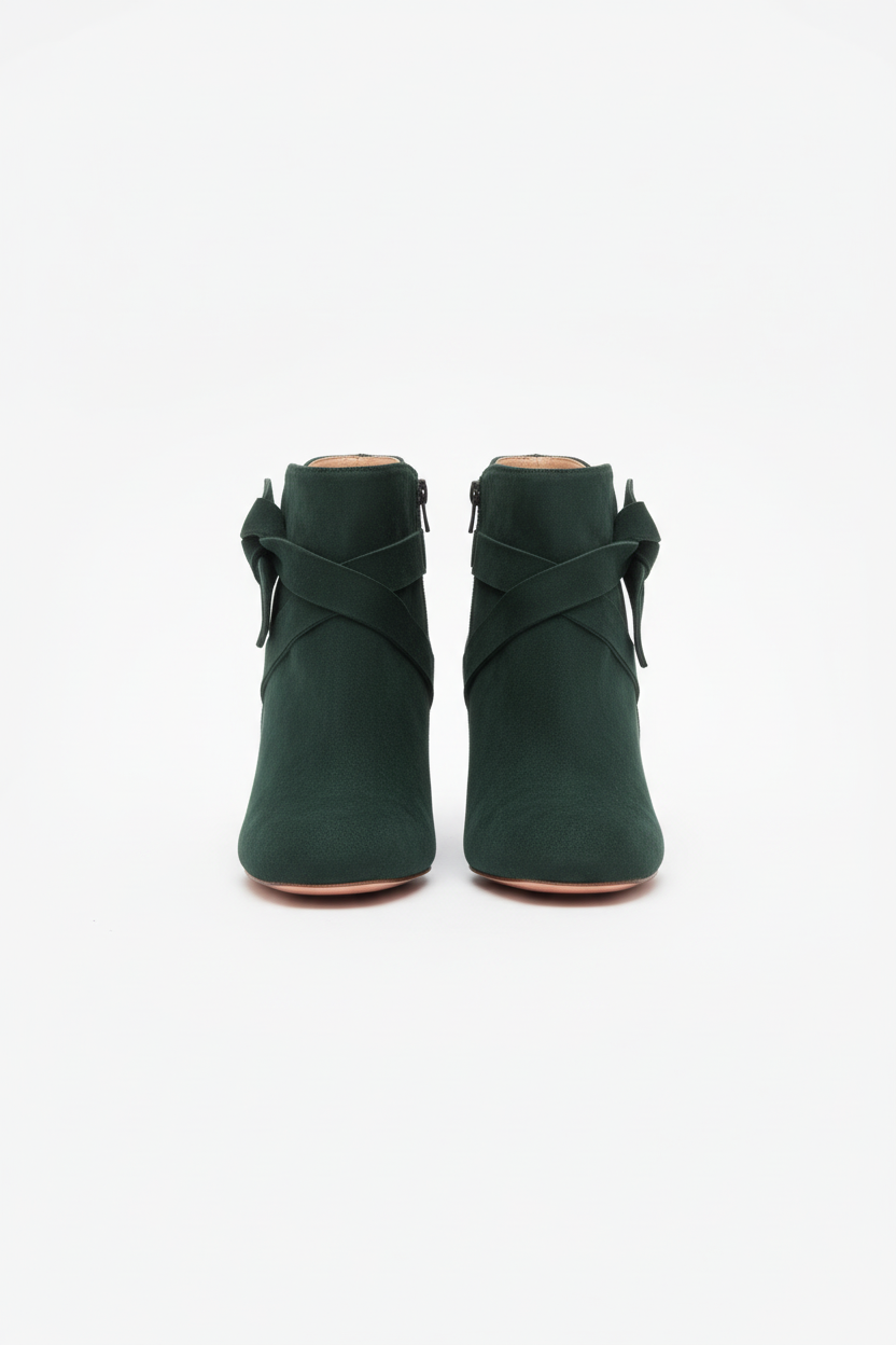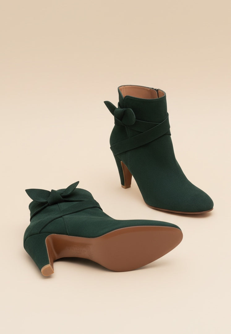 A stylish bootie designed on a classic round almond toe shape with a front crossed strap-ankle and a decorative side bow, interior side zip and slim covered heel. Style this green basil suede combination of Olvera boots with black tights and a wool sweater maxi dress.