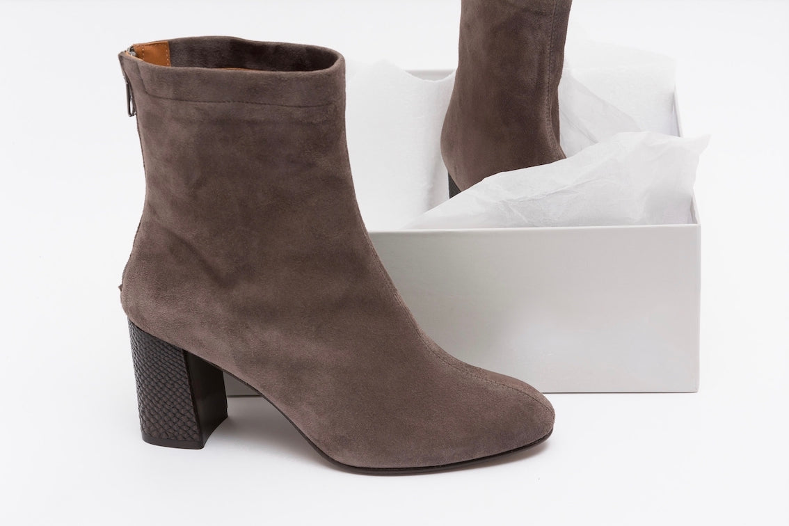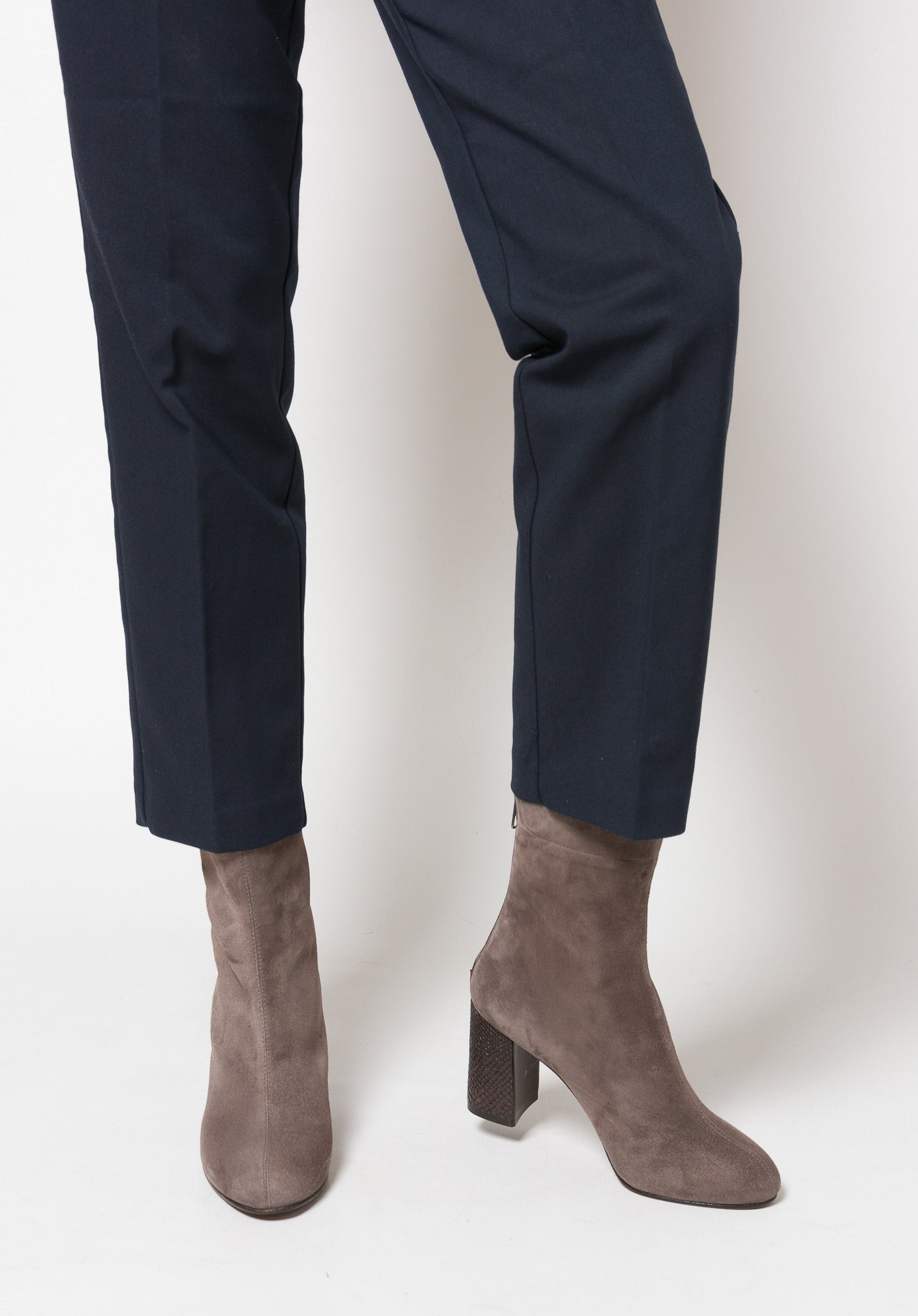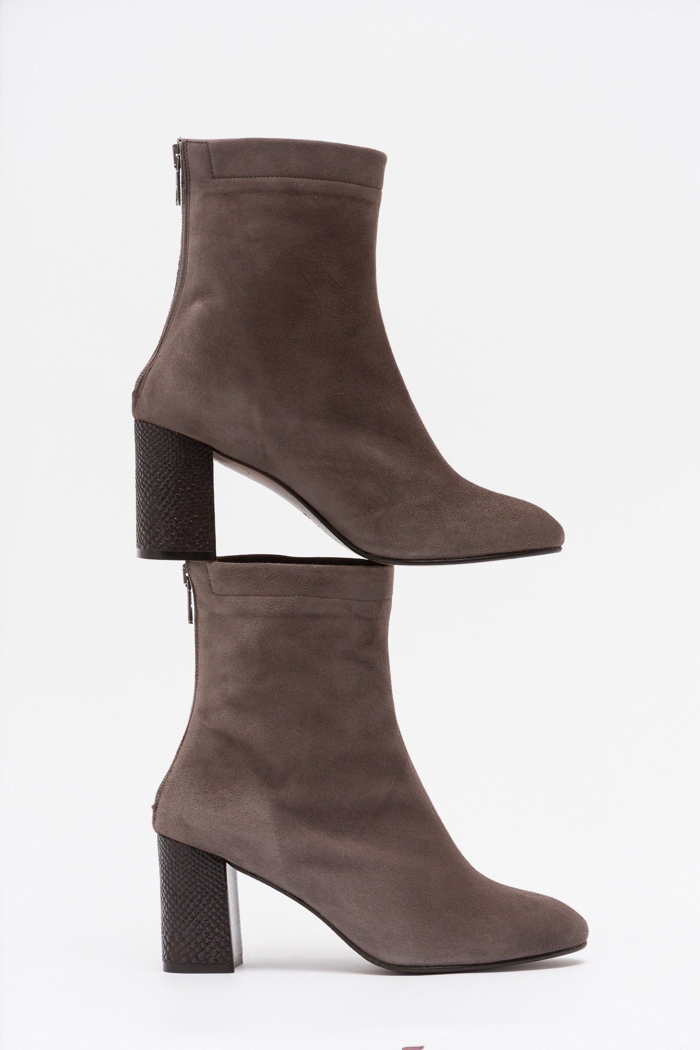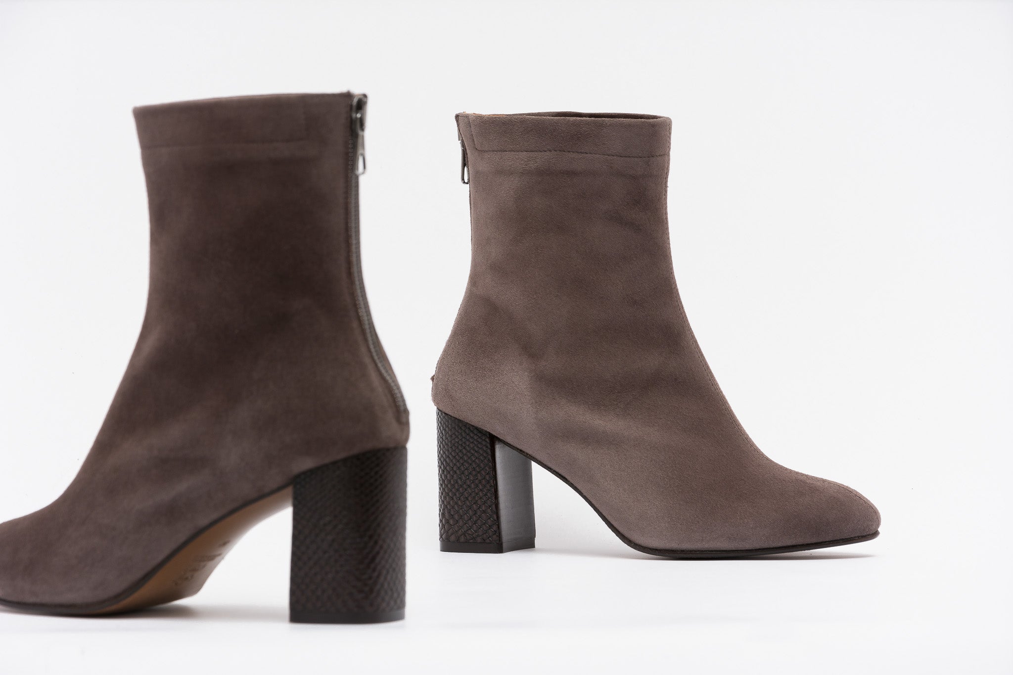 Deanna on suede Taupe is a wardrobe staple for the new fall winter season. Handcrafted on a soft velour, they are fitted with a metallic back zipper and sitted on a decorated stacked cuban heel. Style yours with a pair of mid lentgh retro corduroy pants and basic V-neck tshirts.
