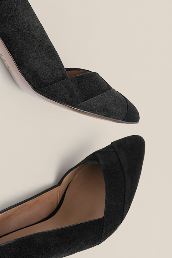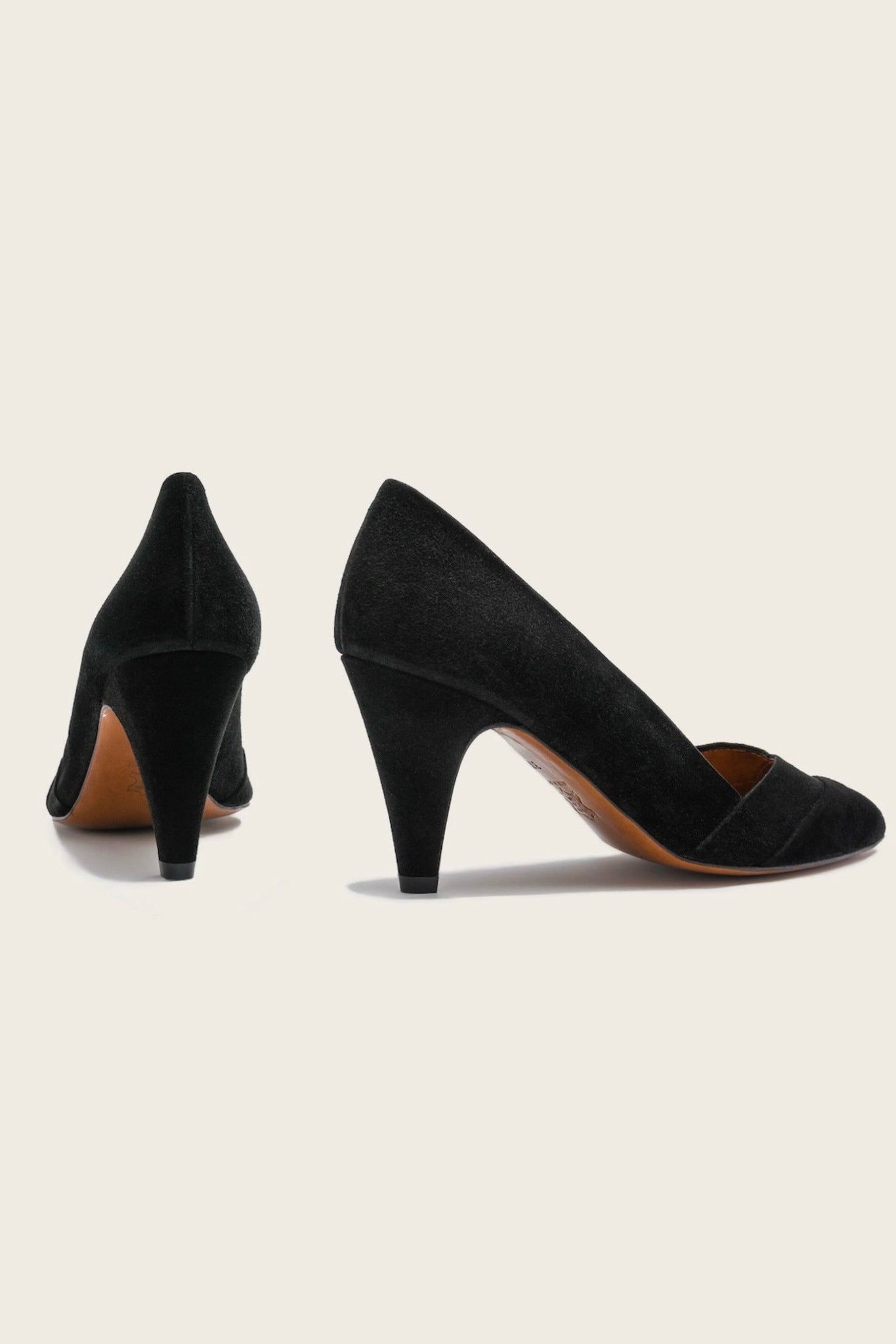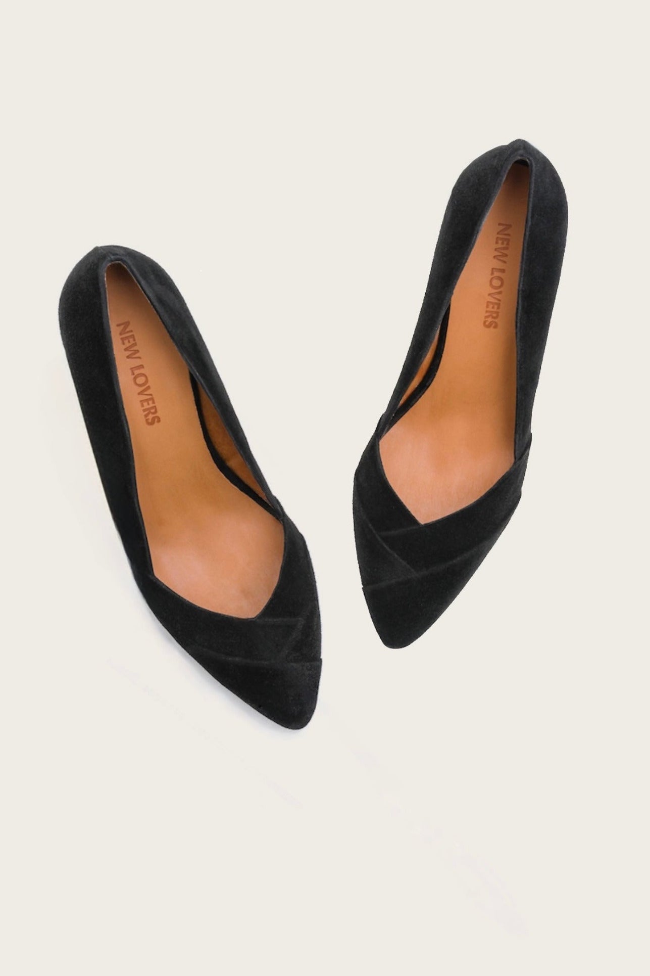 A 60's inspired pump hadcrafted on a soft black velour with a cross femenine cut detail on the toe.Sitting on a confrotable mid cone heel, wear them from day to dark with ease.