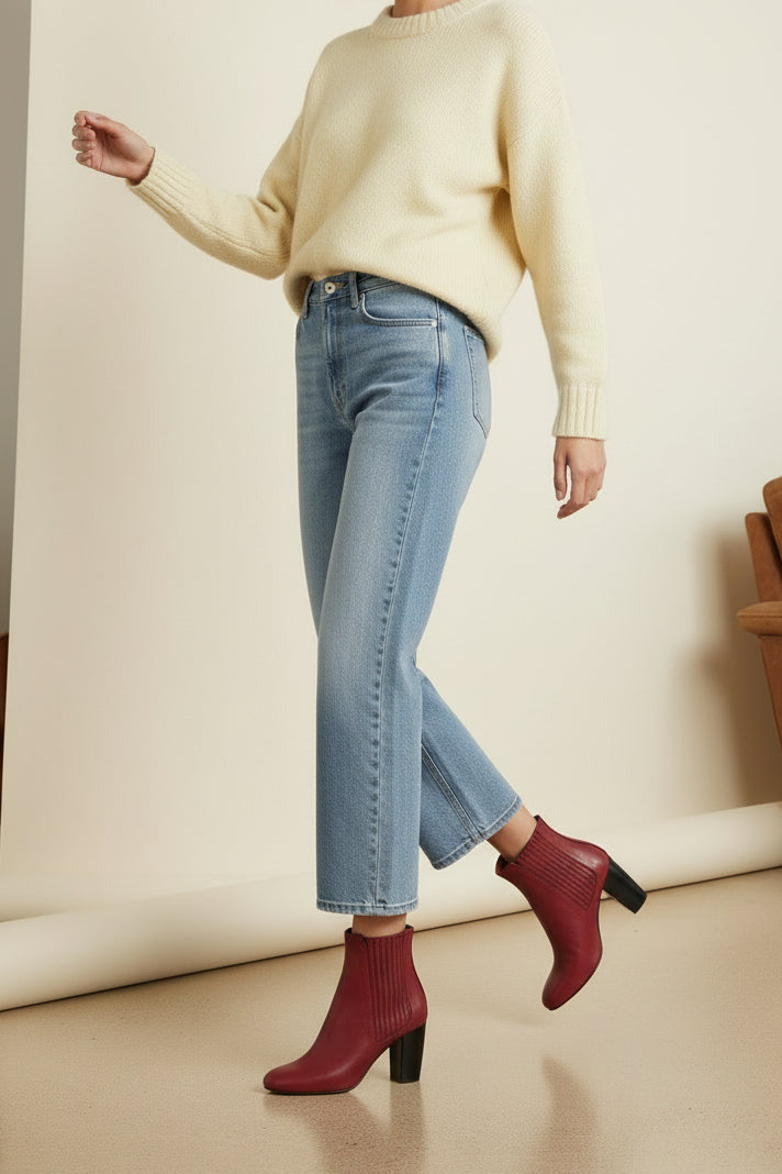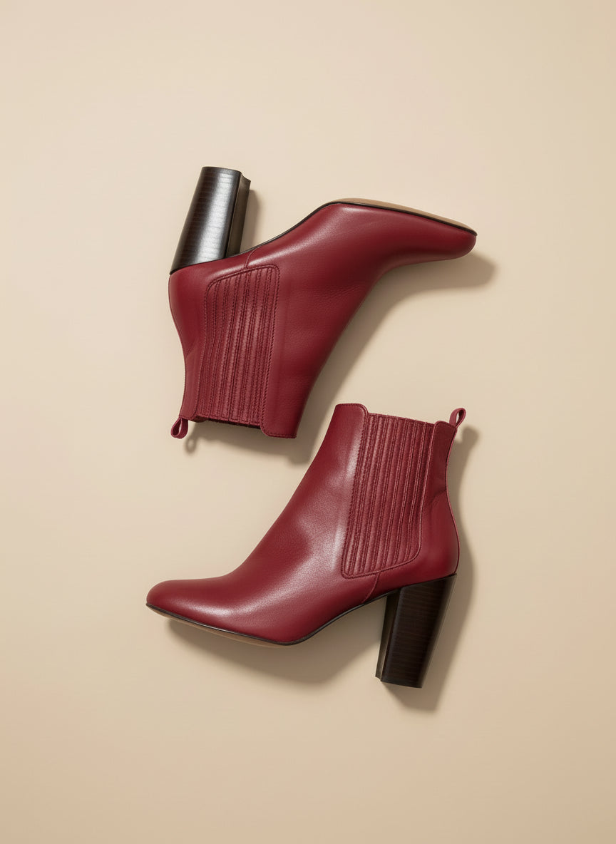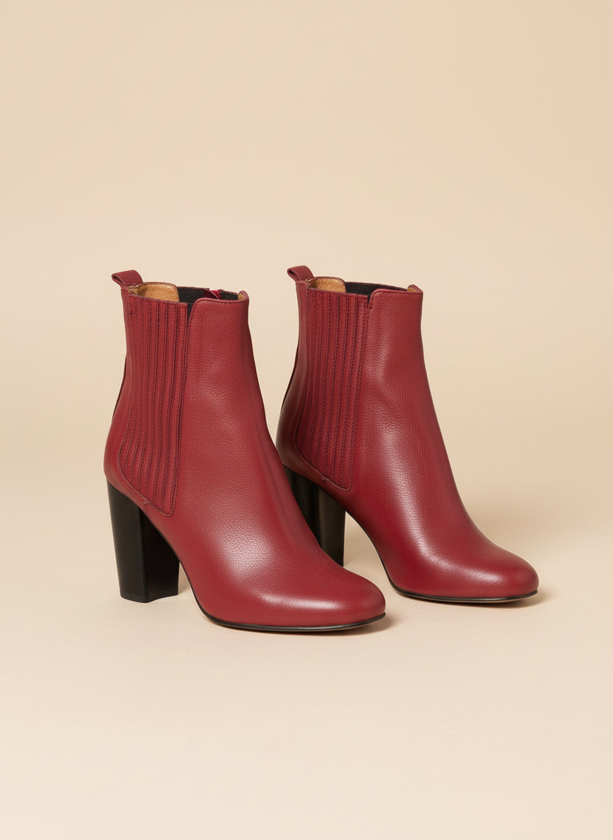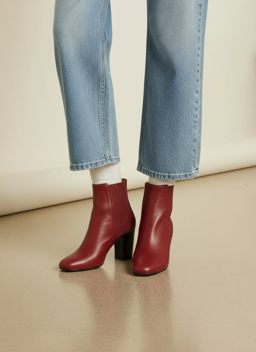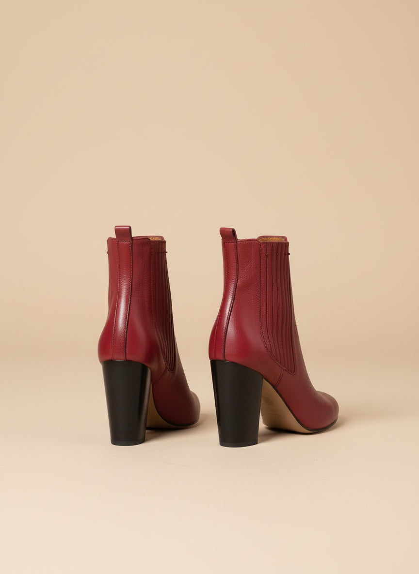 A classic yet super vesatile high heel chelsea bootie in a supple carmine leather with a stacked thick cuban heel. Wear yours with a knit loose-cut sweater dress for a cool off-duty look.