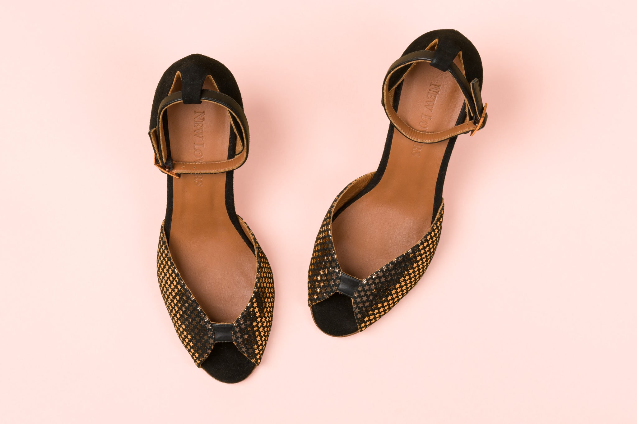 Make a statement with the Jolene this Summer. A chic open-toe sandal in black suede and stamped peach foil stars with a delicate rose gold buckle. Pair with your favorite little black dress and a mini glitter clutch in a bold color for a gallery opening or late night drinks in the city.