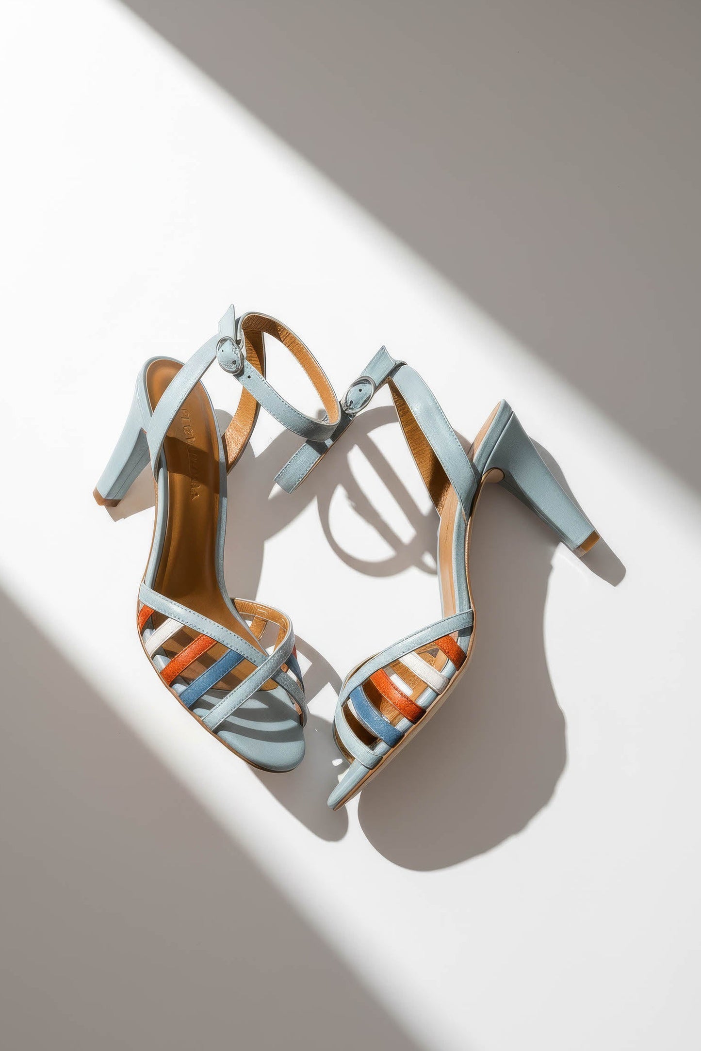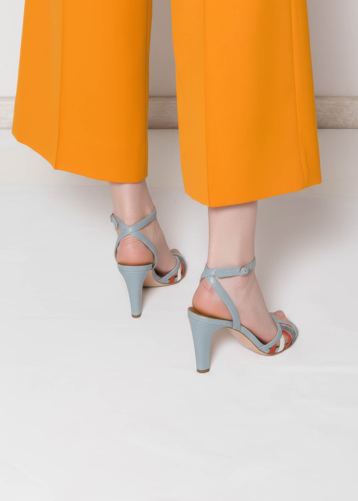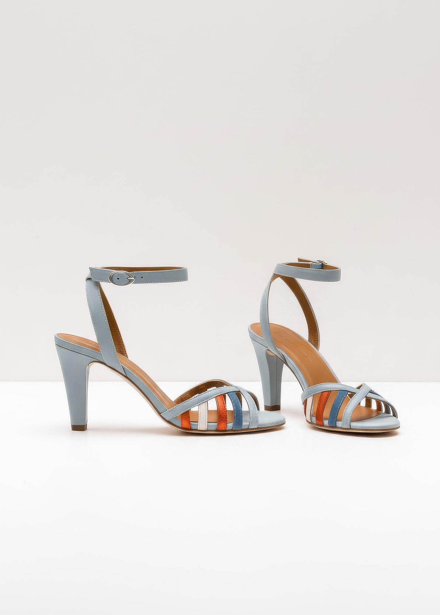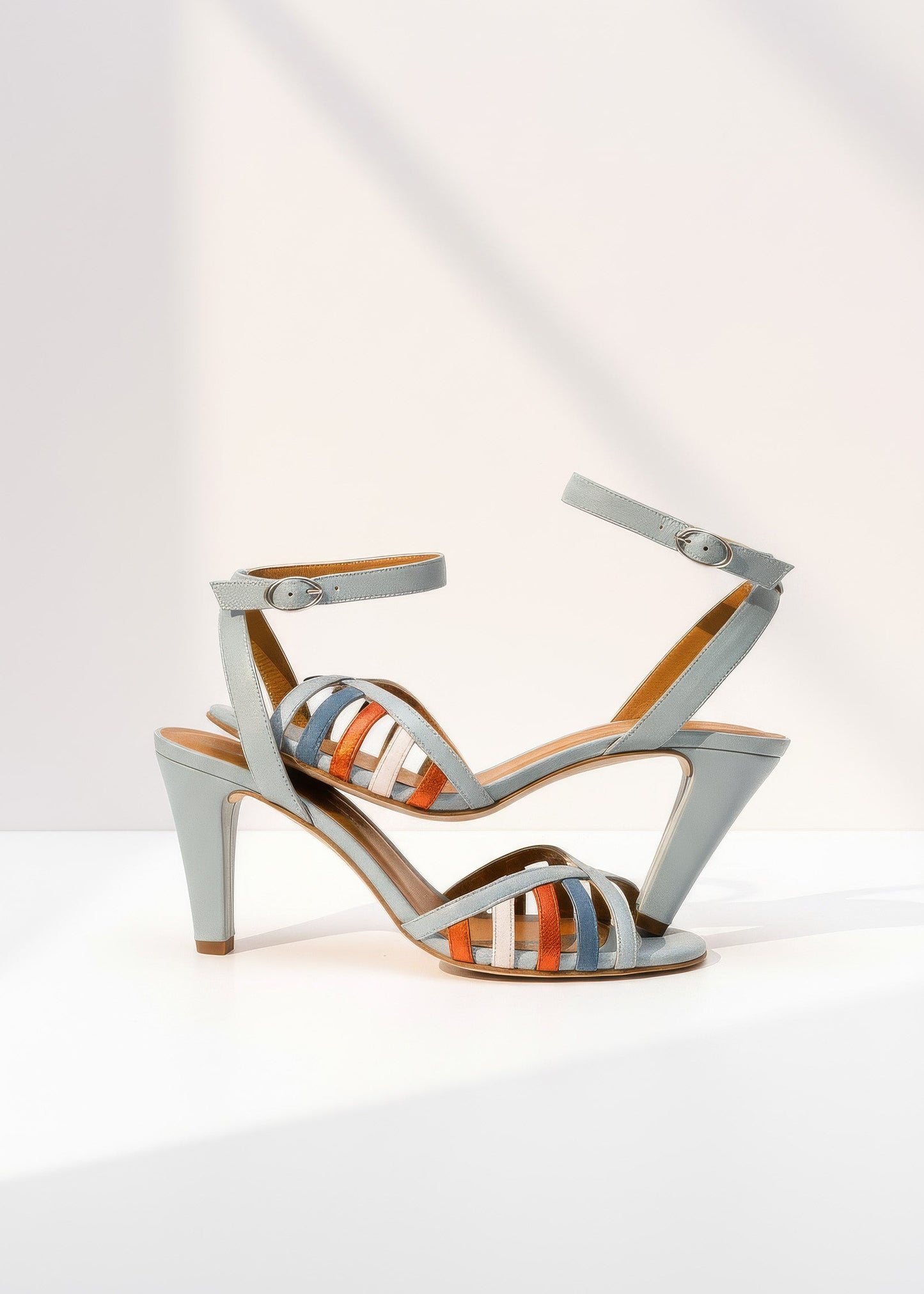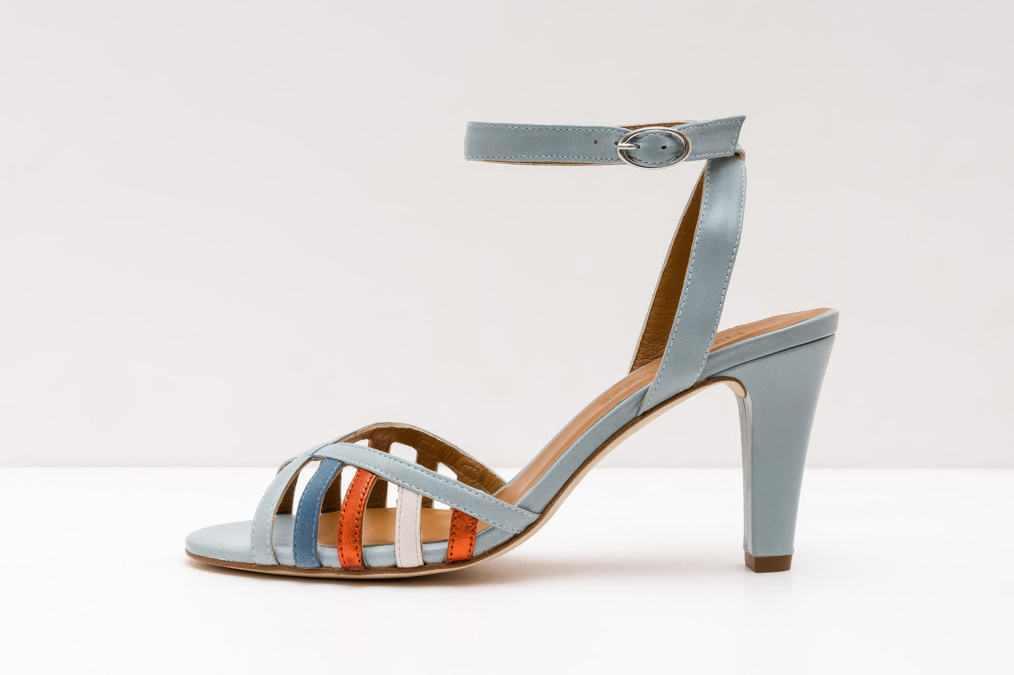 Lou Lou is a multi-colored strap sandal with a hipper feminine touch sitting on a slim classic thin heel. Pair them with a vintage cotton track pants for that wow-contrasting look.