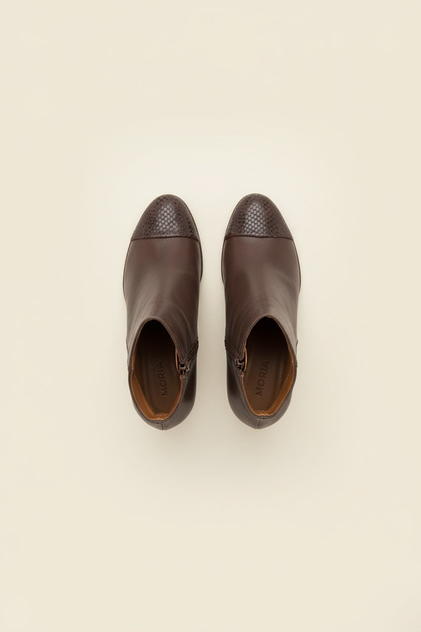Timeless high block heeled ankle boot crafted in vegetable tanned brown leather, embellished with a tone in tone snake cap toe and a side metallic zip fastening. Match perfectly with a pair of cropped flare right above the ankle knit pants and a merino cashmere hoodie.