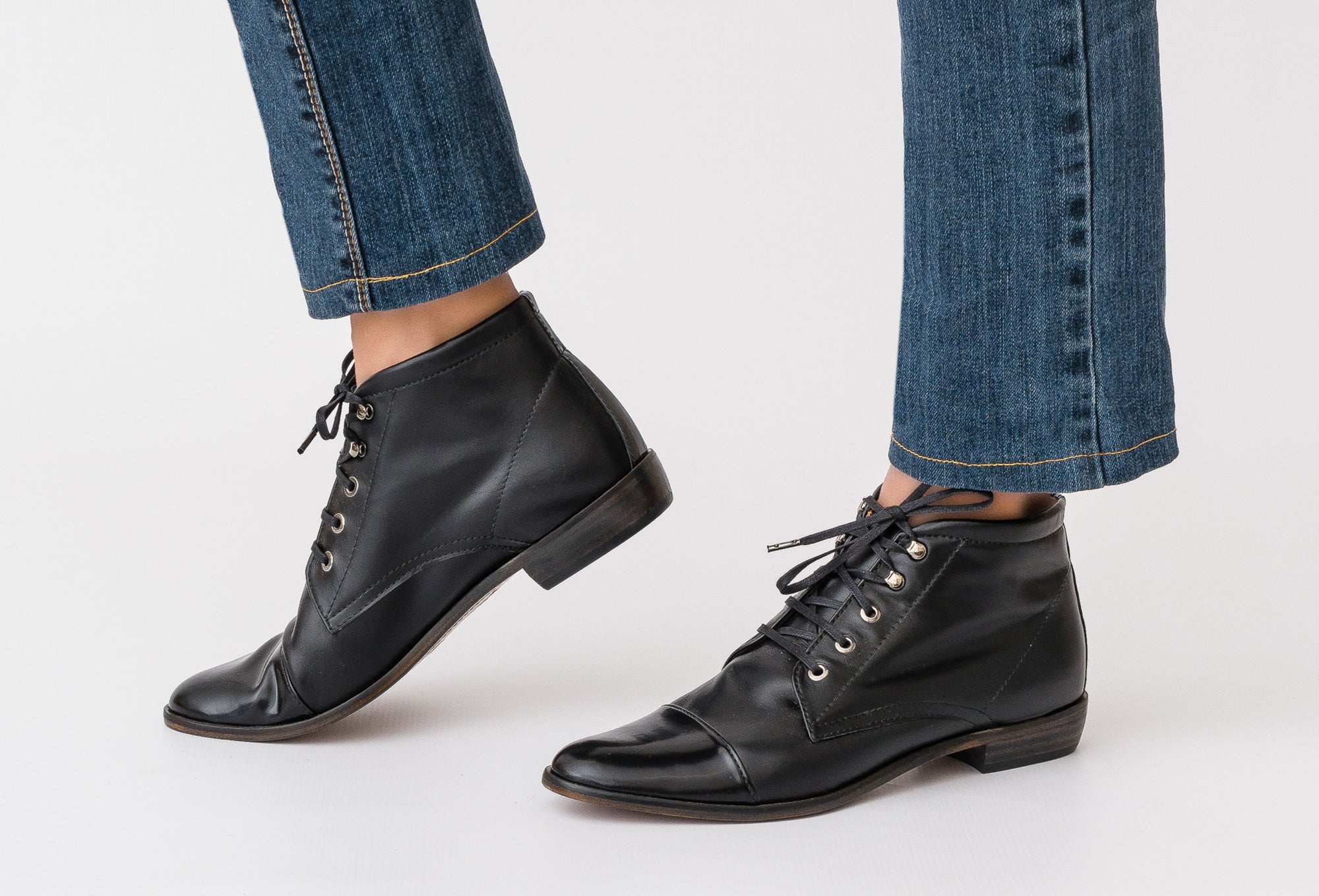 A classic desert boot design in smooth black leather with an almond cup toe on a chic cordoban leather handcrafted in Spain. Styled with a polished toe cap and metal shoelace tips for a unique design with an edge.