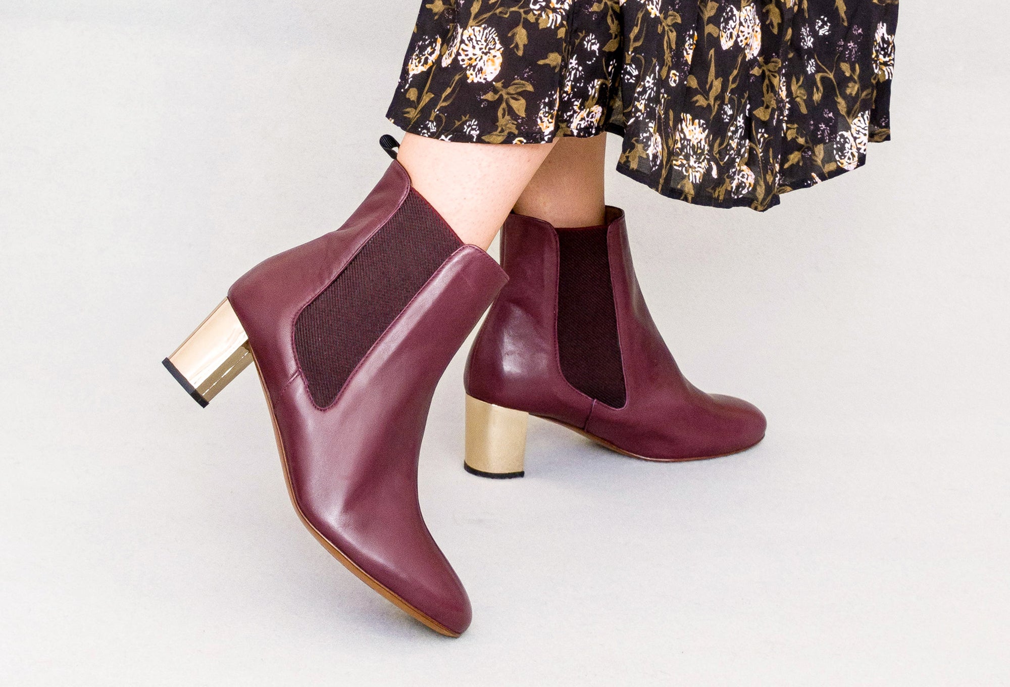 Timeless Autumnal Chelsea boot with a rounded toe and chic metallic block heel in a deep wine soft natural tanned leather. Style perfectly with a winter tea paisley print dress and grandad wool cardigan.