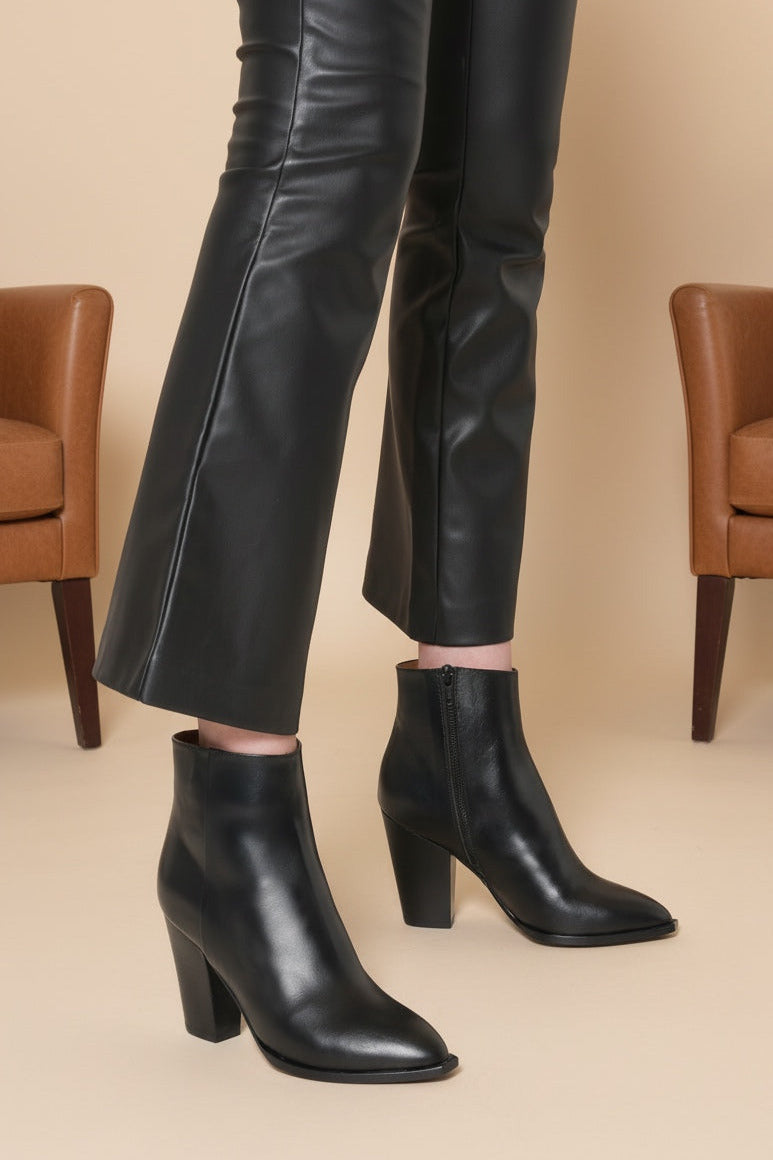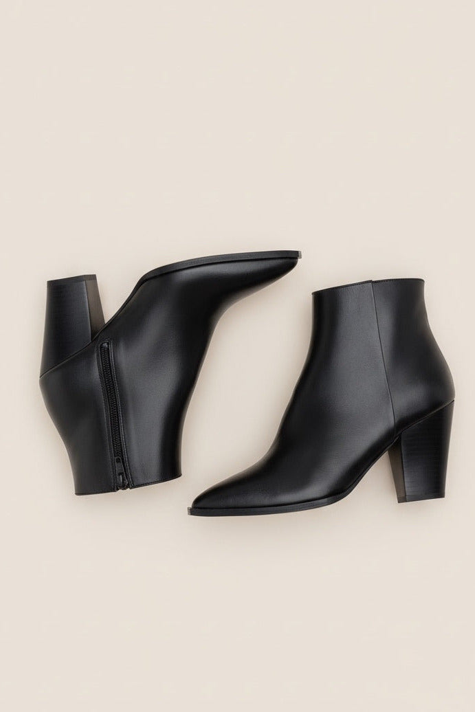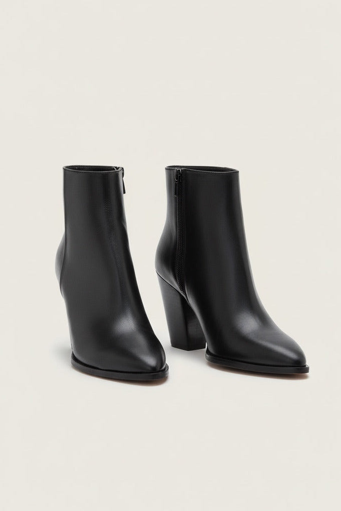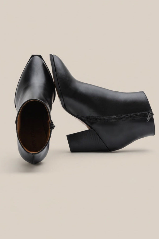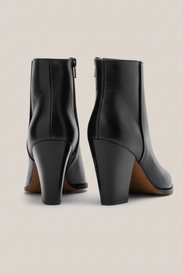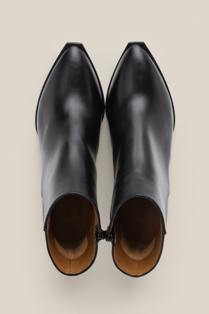 Sheffield is a classy ankle boot and a timeless addition to your shoe collection. Handcrafted in smooth Italian calf leather, featuring a sleek pointy toe, Western-inspired block heel and a metallic inner side zipper. This style is effortless to wear from day to night.